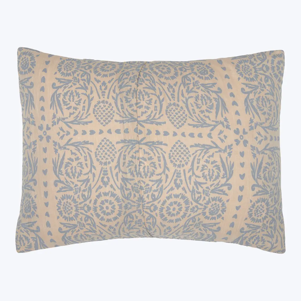 Discover the Raasia Woven Quilted Sham by John Robshaw. Hand-quilted on super soft cotton slub chambray, this beautiful sham’s whimsical pattern was inspired by antique painted tilework from Portugal. Available in Standard, King, and Euro sizes. Pair with the Raasia Woven Quilt.
