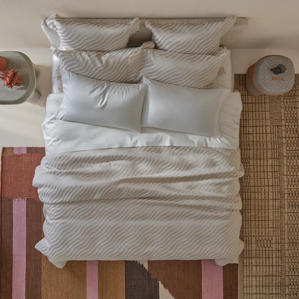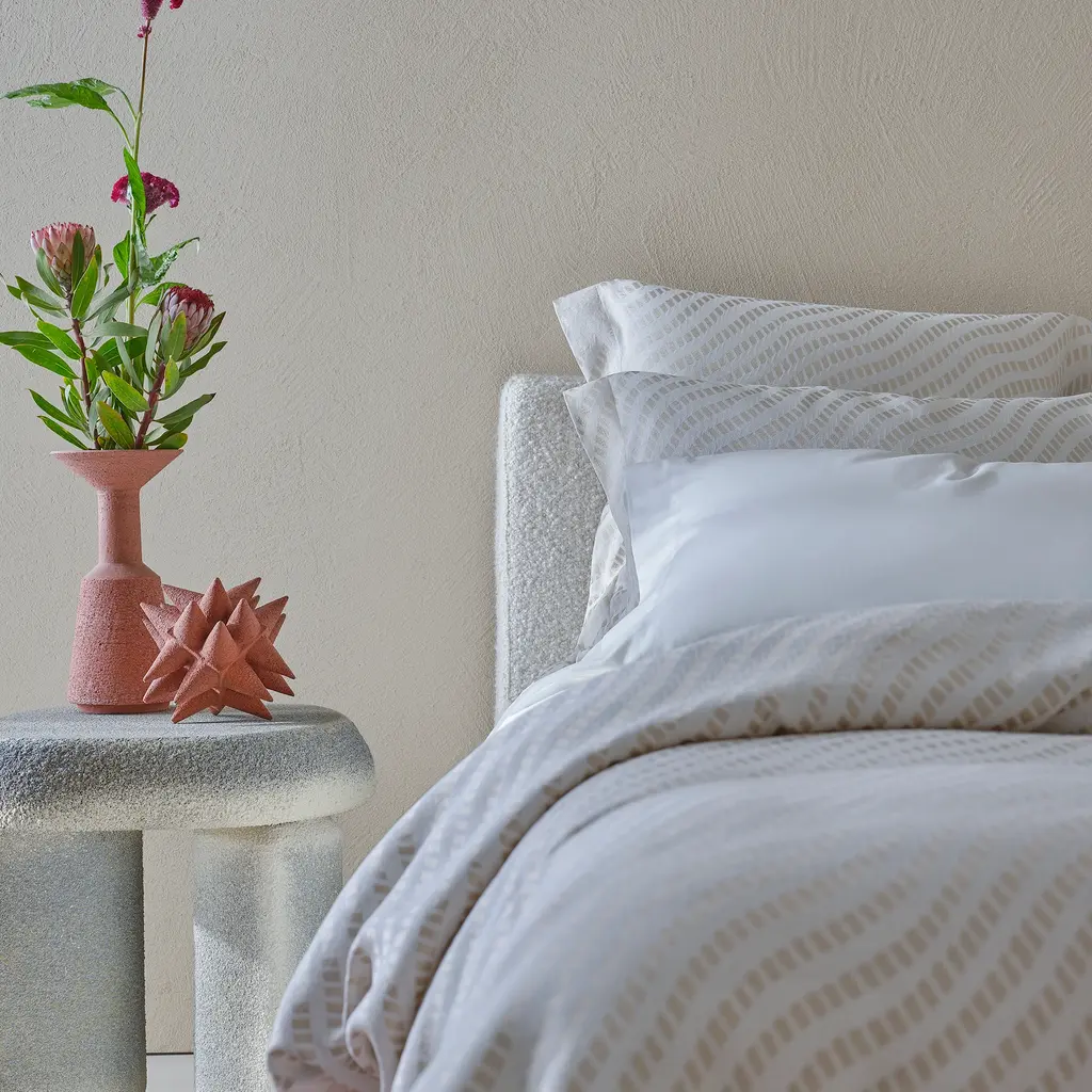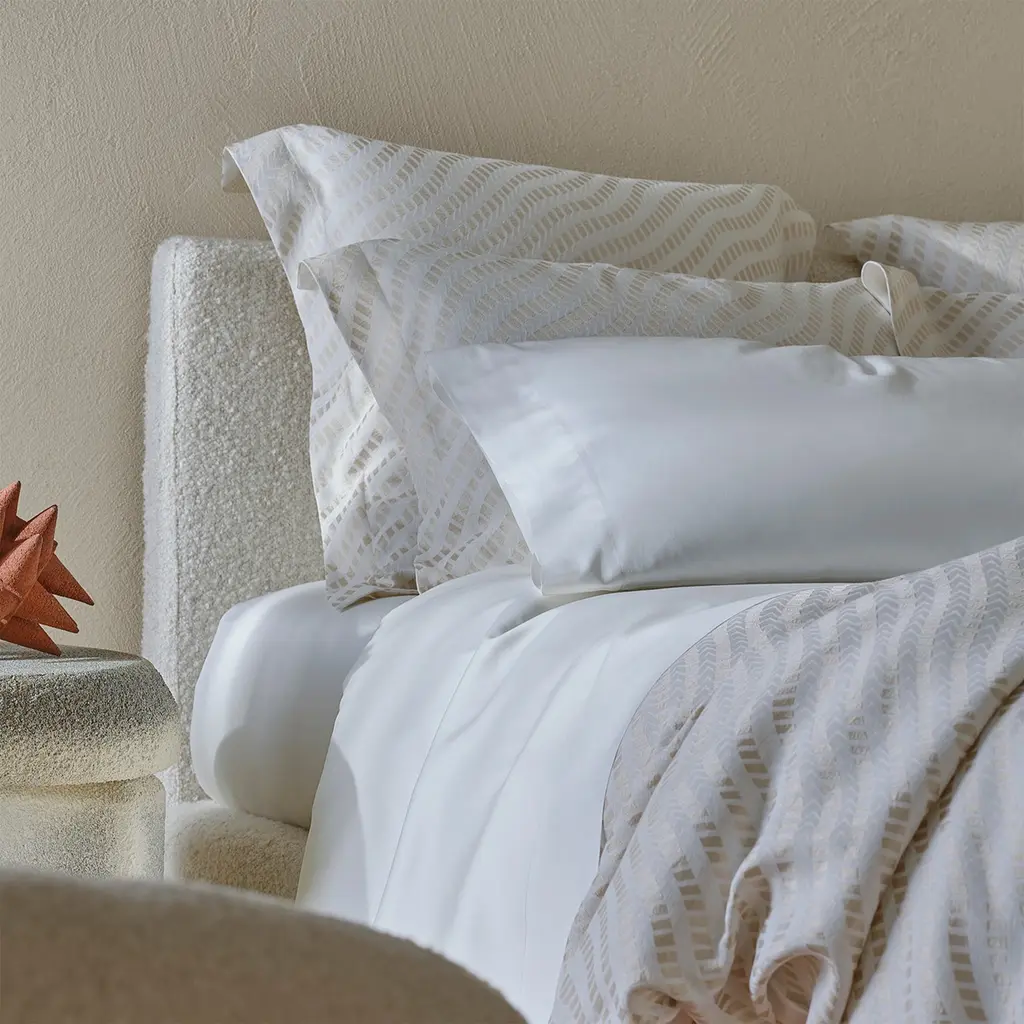 Reflecting the interplay of light and shadow, the Frette Reflex Collection embodies timeless beauty. Showcasing Frette's mastery of exquisite jacquard craftsmanship, the collection's refined design adds a layer of sophisticated to the bed ensemble.