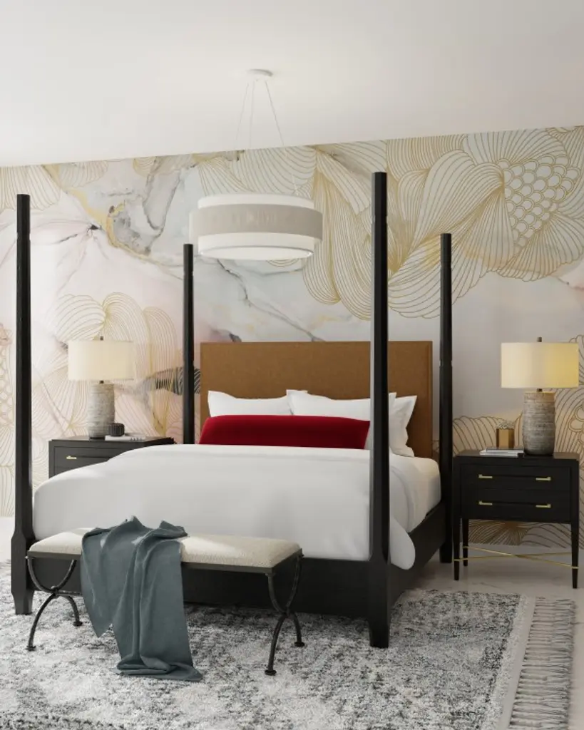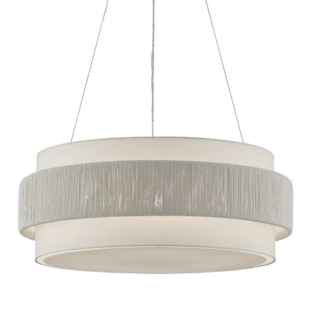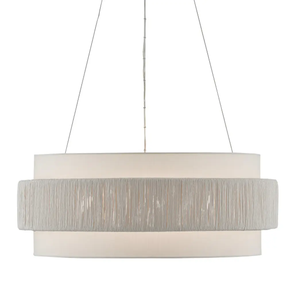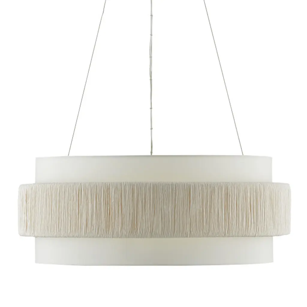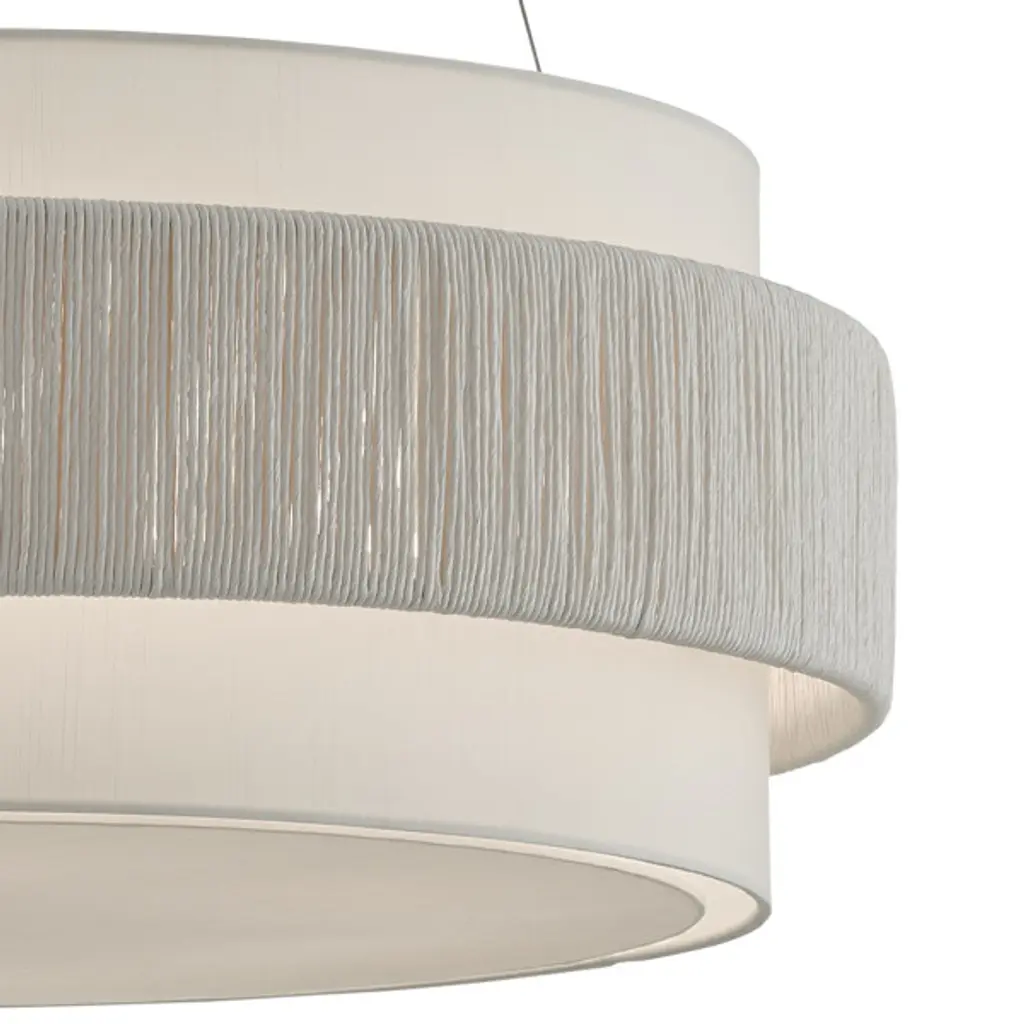 Our Rousham Chandelier, designed by Clarence Mallari, features an unusual accent on its fabric shade with a twine panel made from recycled paper, twisted and tightly wrapped around a metal frame. This sustainable material, affixed to the center of the shade, is coated with a sealant to protect it from moisture. The chandelier is suspended with aircraft cable and has a finish on the interior of the shade that brightens the light. It is adjustable from 20" to 144.5" with the use of an included chain/rod kit/cable.