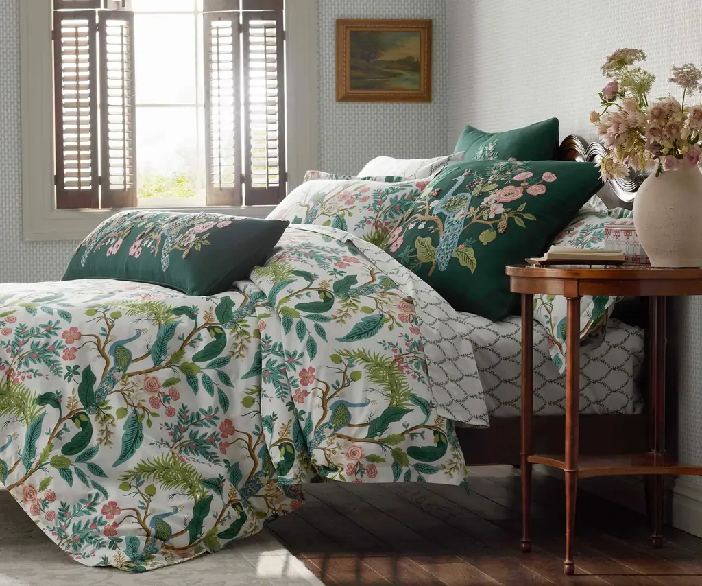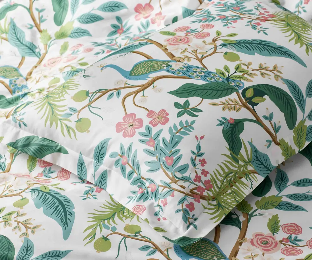 A sham featuring a sophisticated scene of birds perched among winding branches and blooming flowers, with a tranquil color palette of blue, aqua, green, gold and white. This set was created to be layered with our Peacock and Laurel Sateen sheets (sold separately). Crafted of buttery-soft and breathable sateen, this bedding collection has a subtle sheen and beautiful drape that's perfect for all-season comfort. Part of the Rifle Paper Co. x The Company Store collection.
