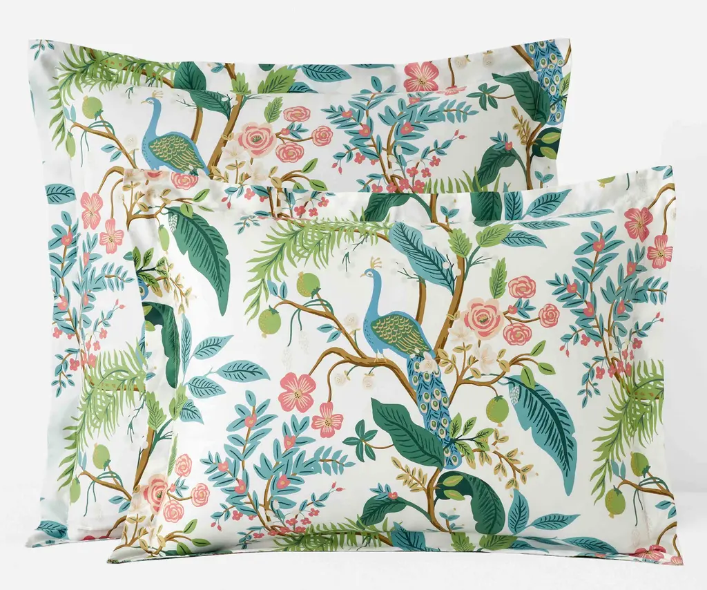 A sham featuring a sophisticated scene of birds perched among winding branches and blooming flowers, with a tranquil color palette of blue, aqua, green, gold and white. This set was created to be layered with our Peacock and Laurel Sateen sheets (sold separately). Crafted of buttery-soft and breathable sateen, this bedding collection has a subtle sheen and beautiful drape that's perfect for all-season comfort. Part of the Rifle Paper Co. x The Company Store collection.