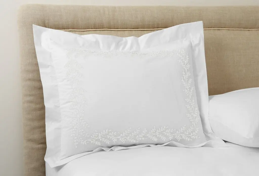 Plumes of the most lush and exquisite stitching decorate SFERRA's soft Italian Egyptian cotton percale Saxon collection, scripted like an ode to the Art Nouveau movement.
