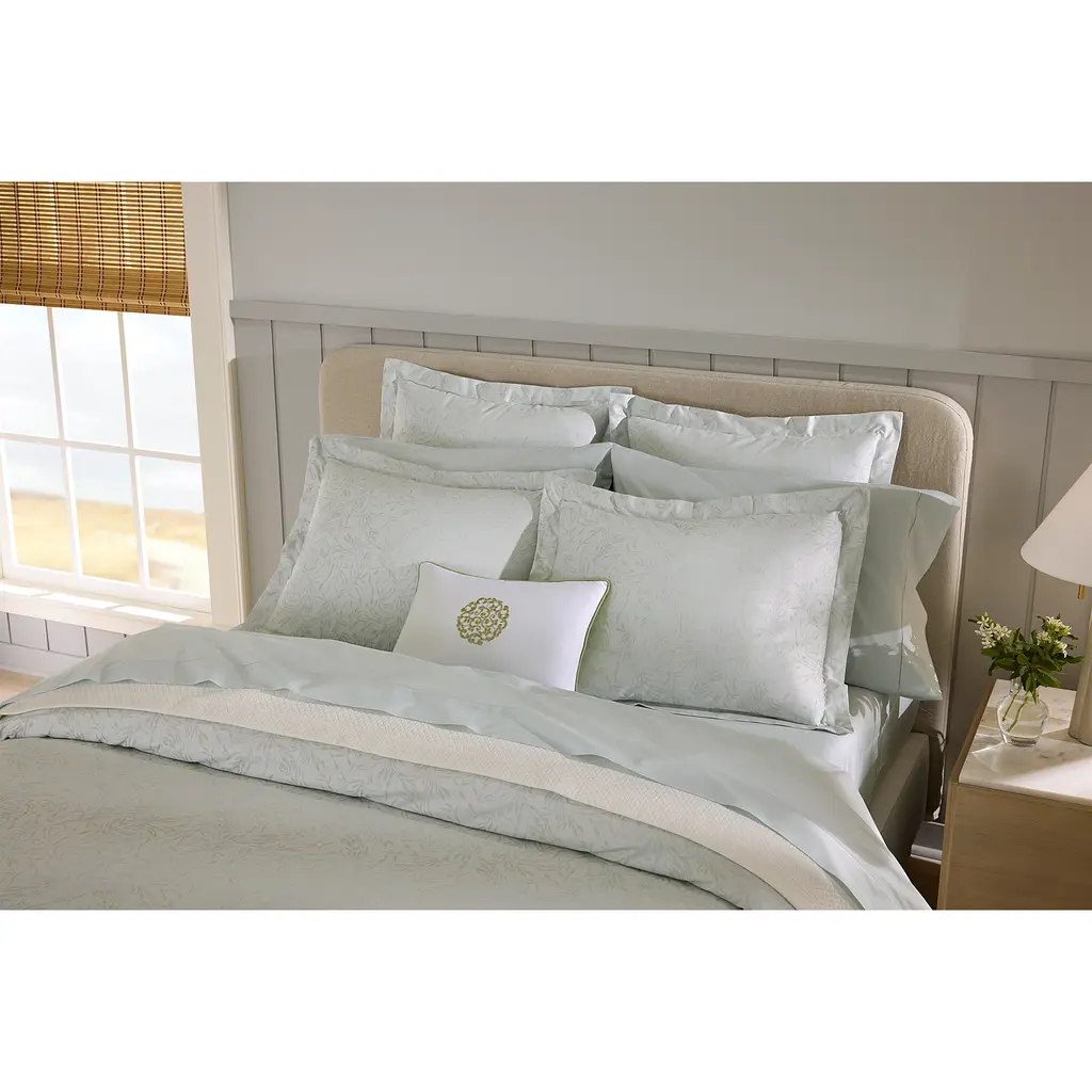 Palm tree fronds swaying in a gentle sea breeze. This tranquil scene inspires the serene beauty of Selini. Crafted from Italian-woven long-staple cotton in a luminous sateen jacquard weave, its soft silver sage palette evokes the quiet elegance of tropical retreats, where nature's calming presence is woven into every leaf.
