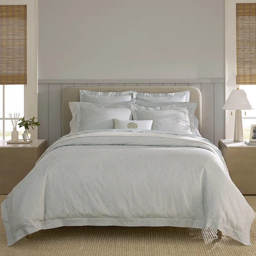 Palm tree fronds swaying in a gentle sea breeze. This tranquil scene inspires the serene beauty of Selini. Crafted from Italian-woven long-staple cotton in a luminous sateen jacquard weave, its soft silver sage palette evokes the quiet elegance of tropical retreats, where nature's calming presence is woven into every leaf.
