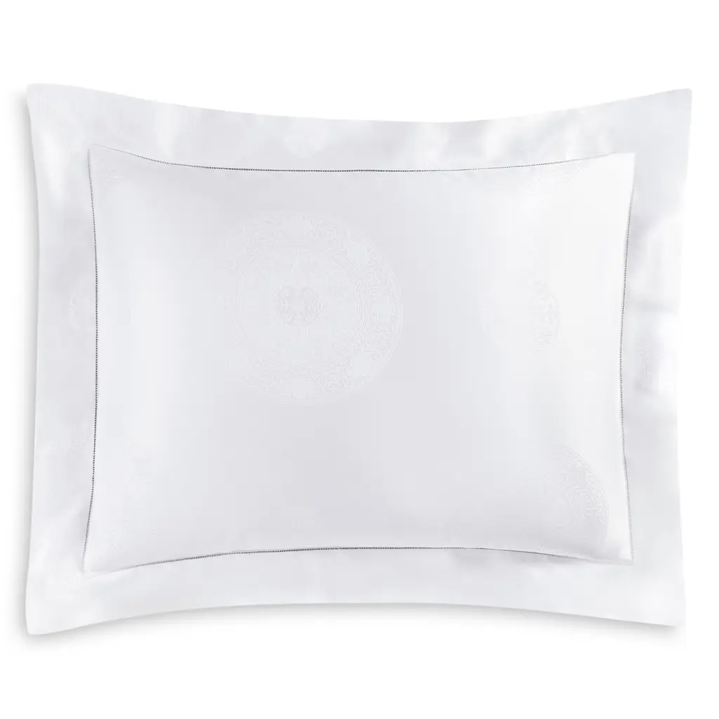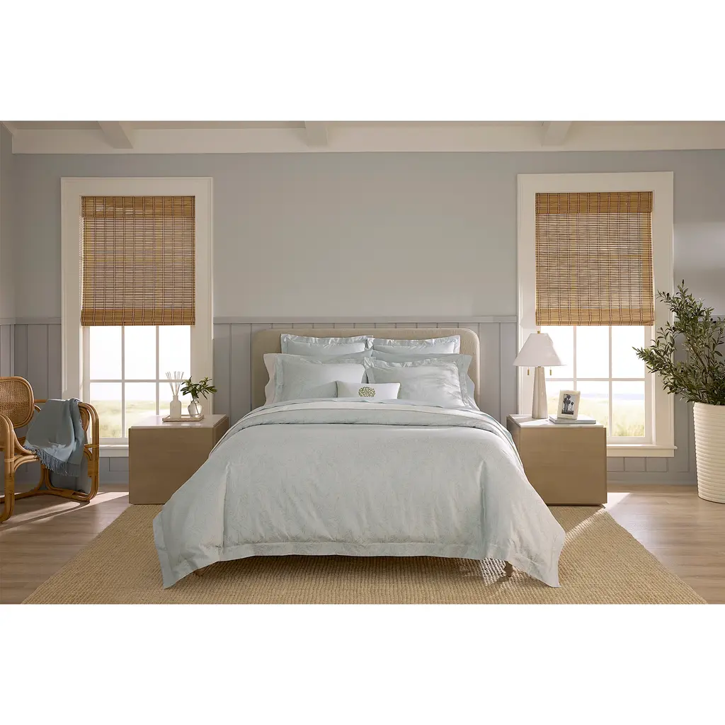 Palm tree fronds swaying in a gentle sea breeze. This tranquil scene inspires the serene beauty of Selini. Crafted from Italian-woven long-staple cotton in a luminous sateen jacquard weave, its soft silver sage palette evokes the quiet elegance of tropical retreats, where nature's calming presence is woven into every leaf.