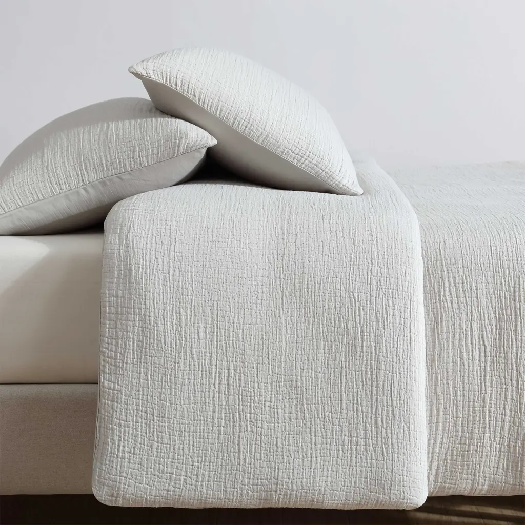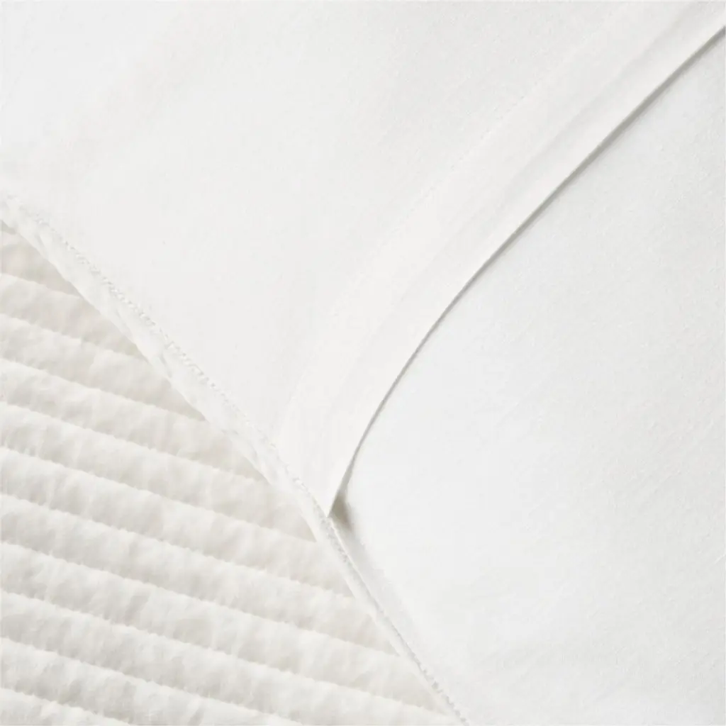 Woven of pure cotton, ivory velvet pillow shams provide a plush layer to the modern bed. Rows of channel stitching enhance its lustrous appeal, adding subtle textural interest. Reverses to 100% cotton in warm white. Pair with matching quilt and our organic cotton percale sheets. CB2 exclusive.