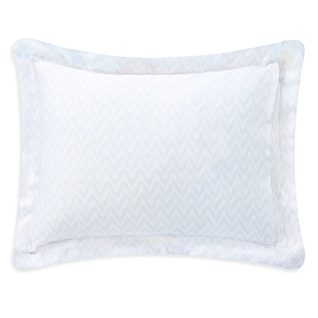 Calme is a modern blue-on-white design of flowering Japanese Quince water-colored flowers coordinated with a sophisticated textured blue-on-white chevron print. Together the two prints combine to make a most beautiful bedding design which speaks of ephemeral beauty. Calme offers one an architectural approach aimed at living a true emotional and spiritual experience by reconnecting with oneself and the environment. A place that promotes a meditative state and wonder in the face of landscapes, seasonal cycles, or living elements. Admire the snowpack of the garden and lull your imagination to the natural rhythm of the winter light. Japanese Quince (Chaenomeles japonica) start to bloom during the cold winter months, even in snow. Their delicate flowers stand out on the naked branches, offering a respite against the gloom of winter. In Art, the Japanese Quince flowers have significant cultural meaning and personify elegance and resilience. The Calme design of flowering branches shows great depth as there are branches in both the foreground and the background and the flowers themselves are depicted in multiple stages, from bud to full bloom. Calme duvet covers, printed coverlets, and shams have the flowering branches print on one side and the very modern textured chevron print on the other side. Calme flat sheets are in the Quince flowering branches print. Calme fitted sheets and pillowcases are in the blue-on-white textured chevron print.