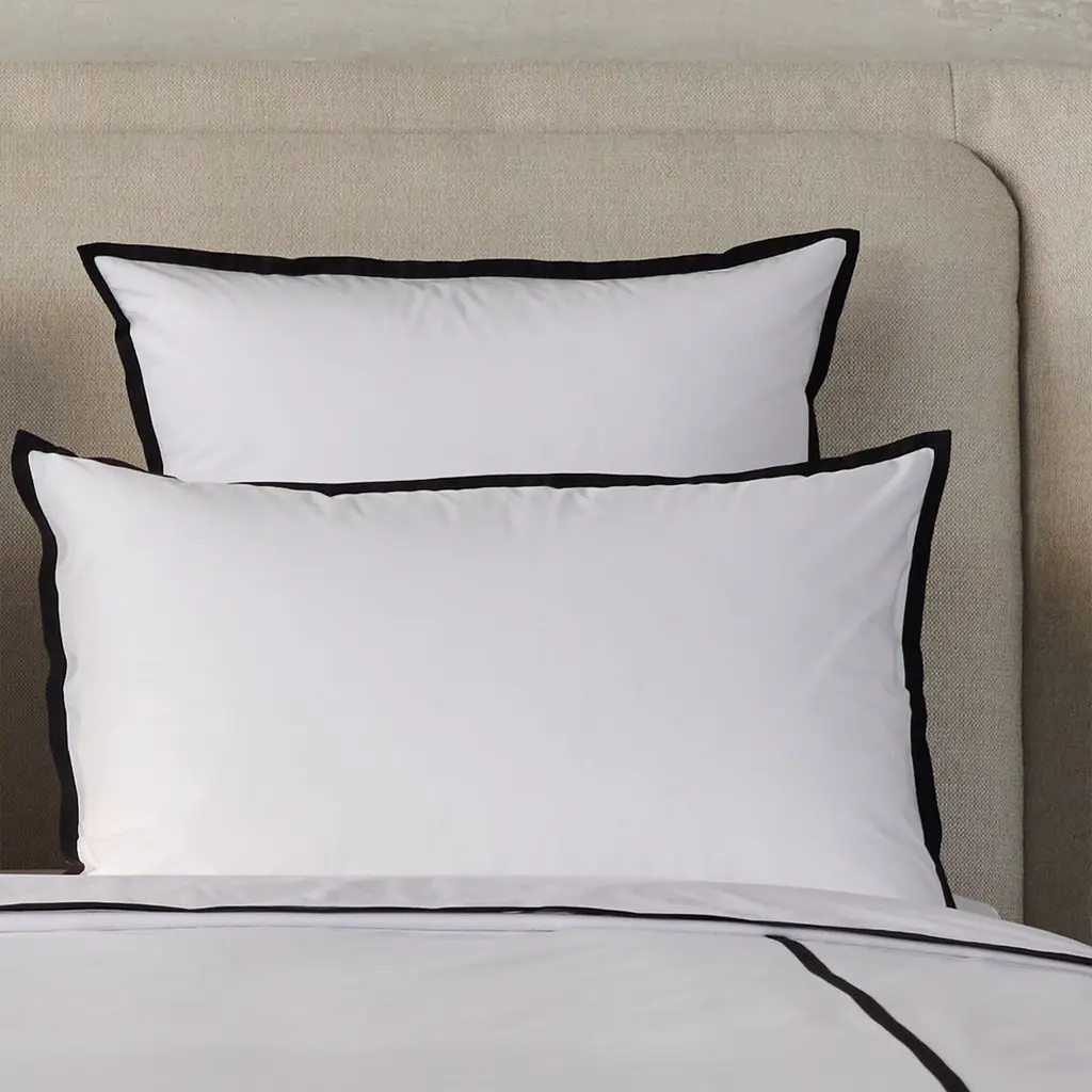 Minimalist and modern, the Fontainebleau bedding design embodies refined and timeless elegance. Crisp white percale bedding is expertly embellished with appliqued banding. The banding is in Fusain, a silvery-black fossilized charcoal color. The Fusain color, against the pure white, is very eye-catching and modern. Fontainebleau duvet covers have a very high style layout of the appliqued banded lines on the front side. Applique means that the fussian colored bands are expertly sewn atop the white fabric. Fontainebleau flat sheets have the appliqued banding at the top edge. Fontainebleau shams have the appliqued banding on the cuff Fontainebleau fitted sheets are in the plain white percale bedding. The Fontainebleau bedding is named for the very famous Chateau de Fontainebleau in France. The appliqued banding on the bedding was inspired by the well known windows of the French palace. With a history of 900 years, the palace has been the home to French kings and even Napoleon I and Napoleon II. Today the 1,500 room Fontainebleau palace is a UNESCO World Heritage site.
