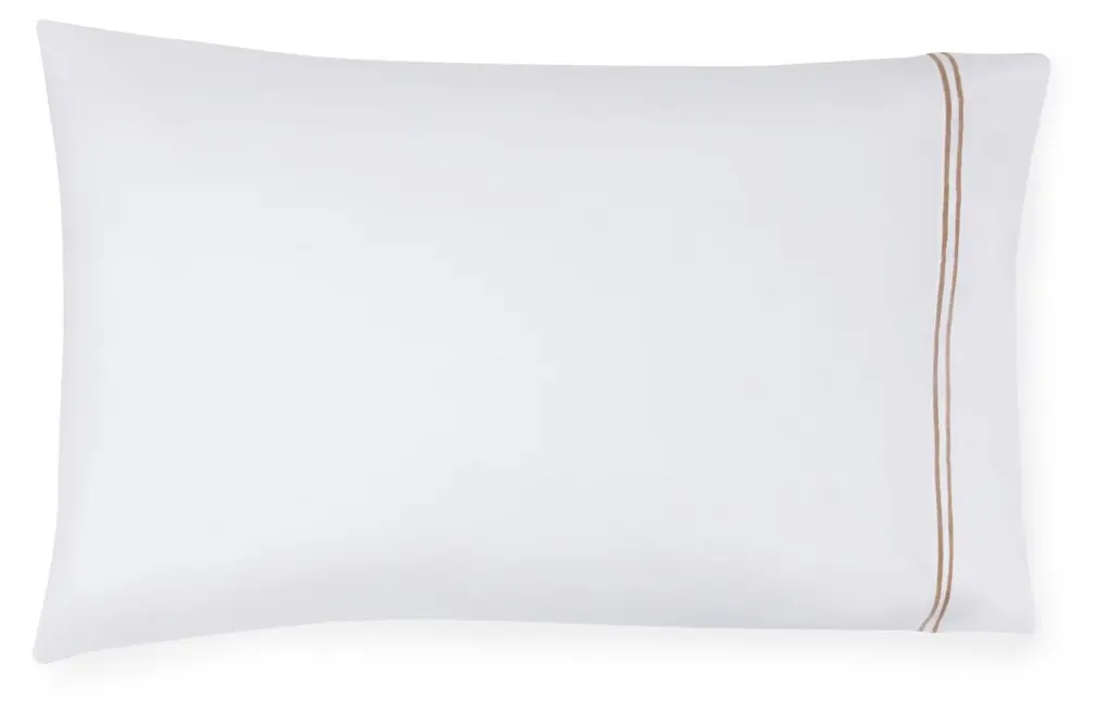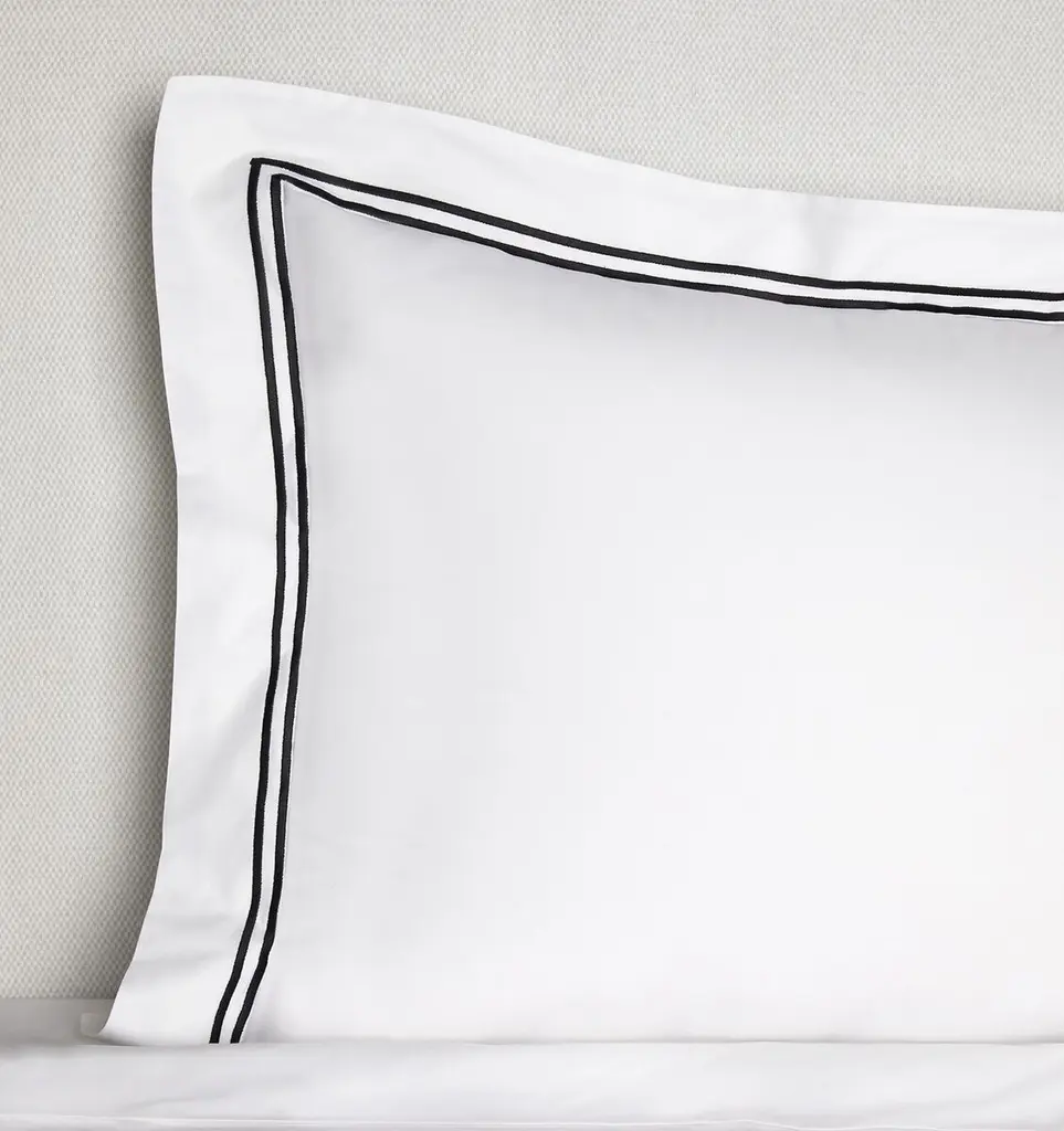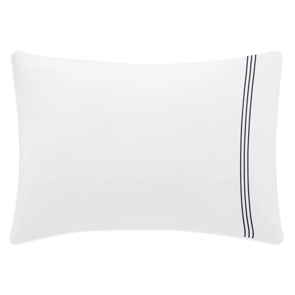 Concorde, meaning harmony in French, offers chic, timeless style of pure white embellished with modern embroidered lines in marine navy blue. Three rows of bourdon embroidered lines in marine navy blue on the pure white sateen bedding enliven the Concorde design. The hand guided marine navy blue embroidered lines run the length on one side of both the duvet cover and the shams. Fitted sheets are in pure white and do not have any embroidered embellishments. The embroidered line detailing is expertly executed. Concorde shams have an envelope enclosure which hides the pillow insert from view. Sateen construction, 300 TC, made of 100% long-staple combed cotton.