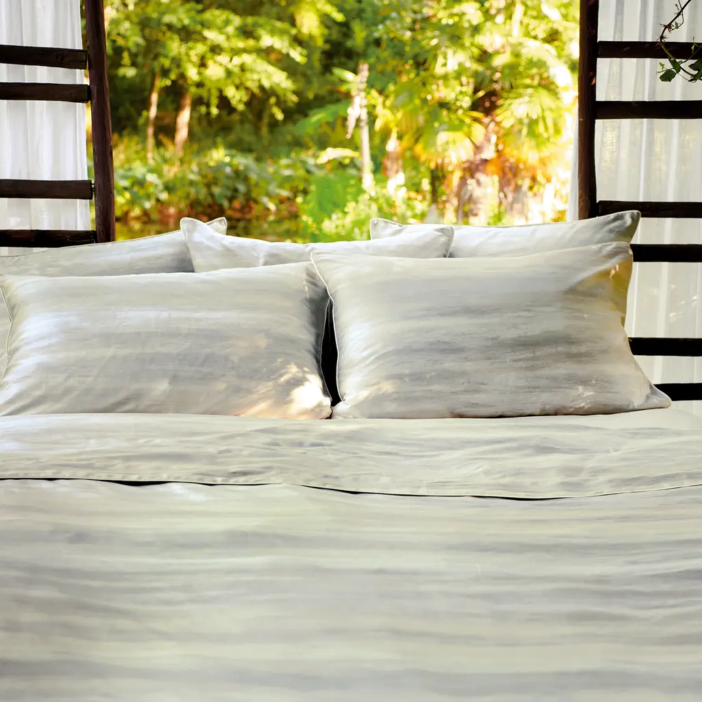 A soothing and exotic journey along the Nile serves as the inspiration for the beautiful, contemplative Sillage Collection from Anne de Solene. Sillage is the French word for "wake," and, like infinite wakes, elongated lines ripple across soft sateen in this lovely bedding. The eye gets lost in the transparency of the river and the geometric shapes of the water.