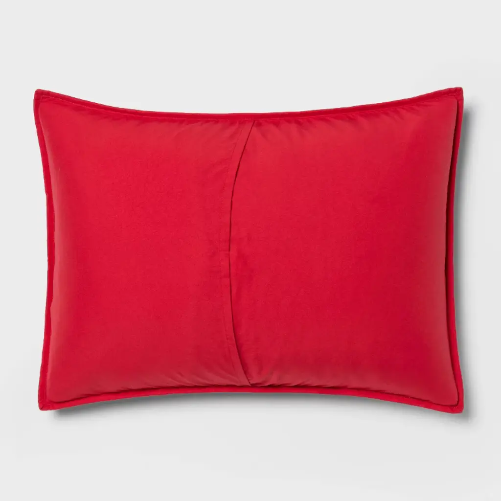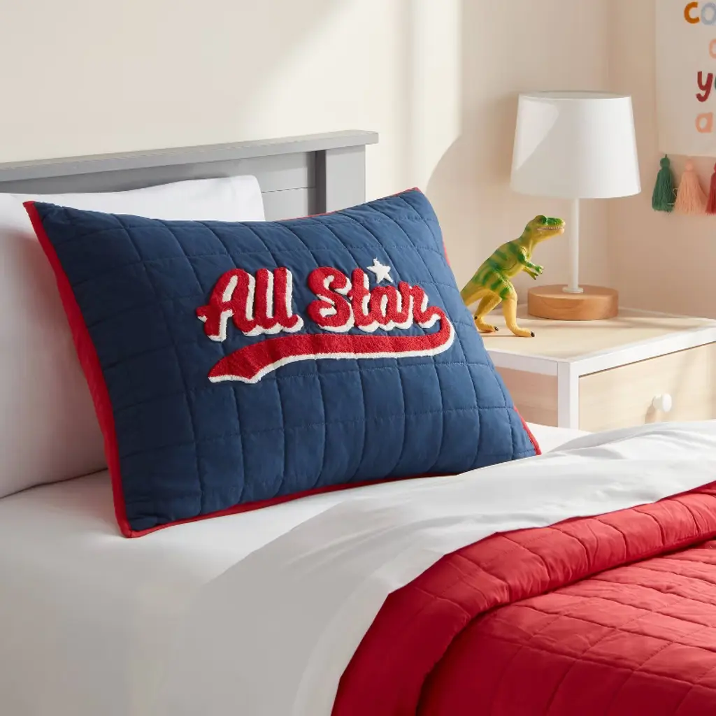 This Standard All Star Sports Pillow Sham from Pillowfort™ adds warmth and personality to your child's room. The microfiber sham showcases a box-stitched front in navy blue with a tufted typographic design that reads "All Star" in red and white with a white star, contrasted by a bright red reverse side with matching red piping trim. Made from 100% recycled polyester and backing, this machine-washable sham with a six-inch envelope closure adds comfort and functional style to their bedroom linen collection.