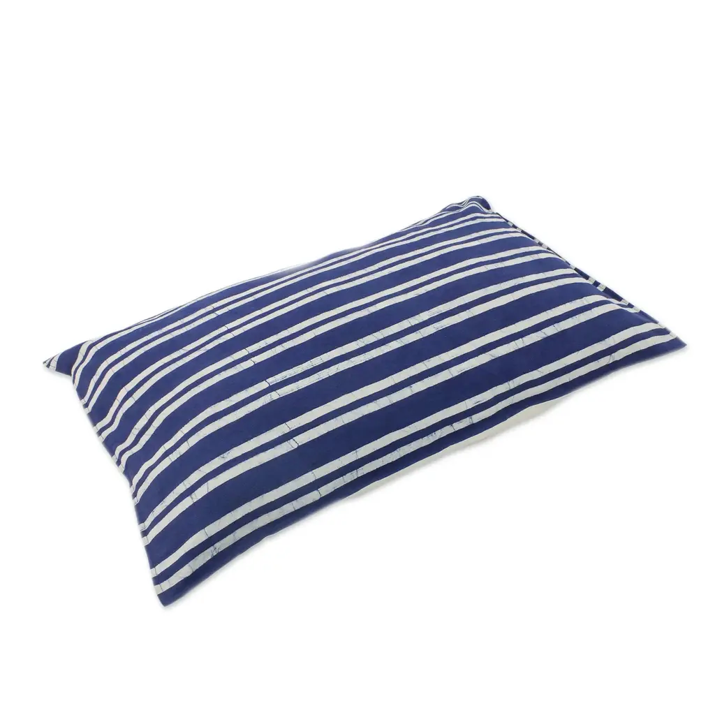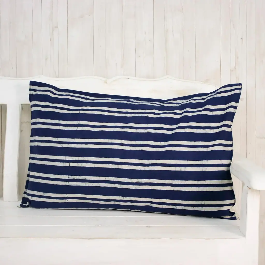 Designed by Simone Buys, this charming pillow sham from Thailand will accent your bedroom perfectly. The sham is crafted of cotton, decorated with a batik resist technique to create simple stripe motifs in indigo and white. A cotton backing completes the sham, featuring a slit for inserting a cushion.