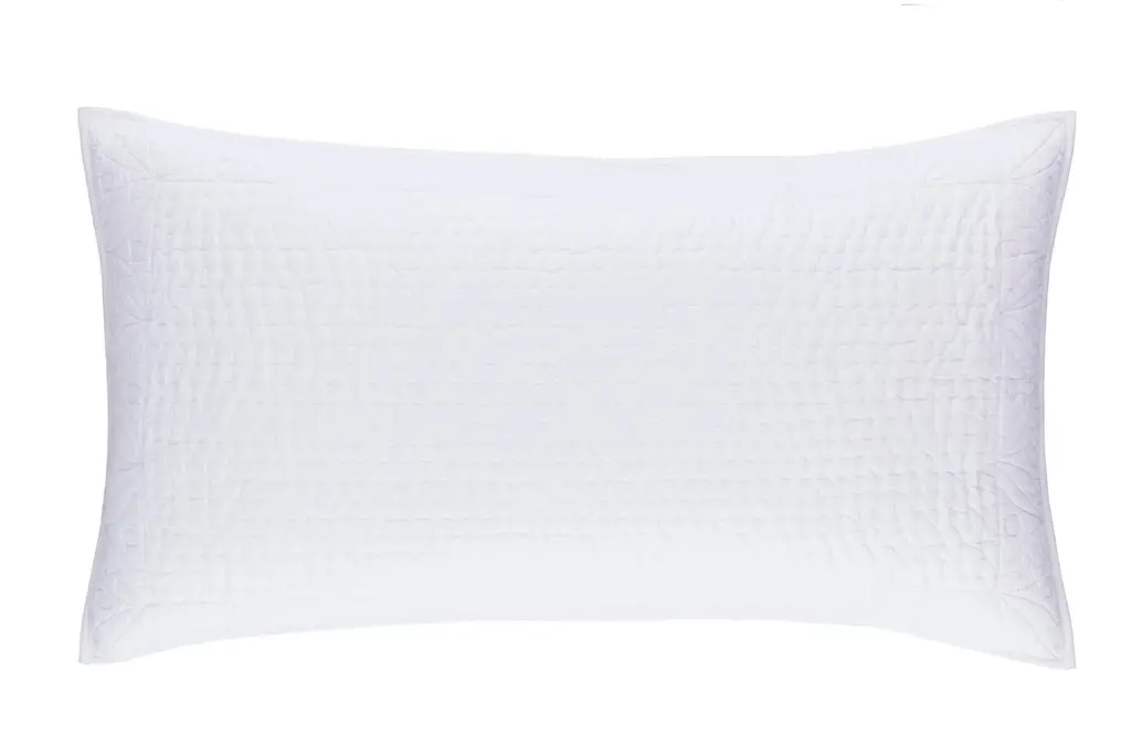 Boutis inspired modern version of Grandma's clean and fresh, all white needlework. Crisp channels of mitered stitching border a central body of leaf motifs, comforting, cottony and cozy, evoking simpler more innocent days. This sham becomes the perfect lightly textured addition to an all white bed or sofa.
