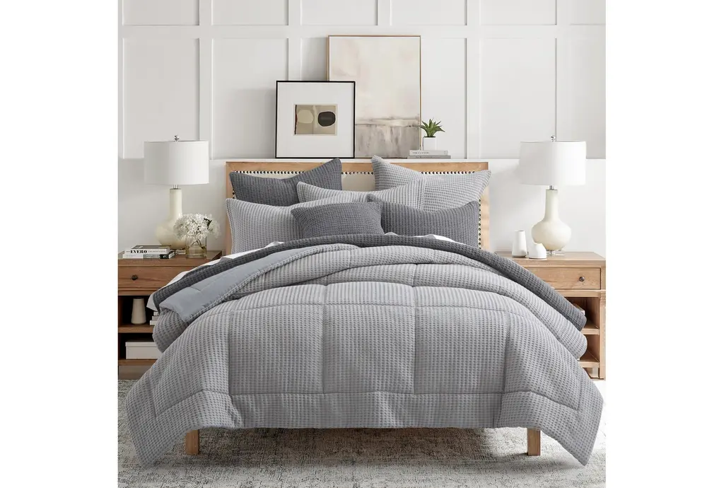 This Twin Comforter set in pewter grey features a waffle weave design that brings a touch of rustic chic to your bedroom. The 100% cotton material ensures a soft and comfortable sleep, while the solid color provides a versatile and neutral look. This machine washable set includes a comforter and a sham, making it easy to care for and maintain.