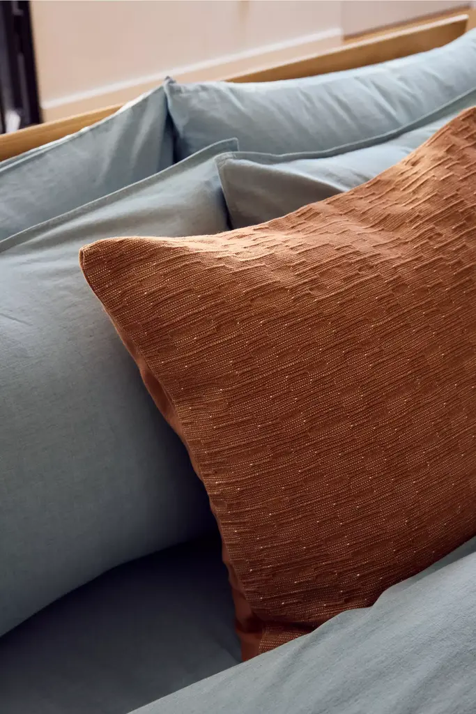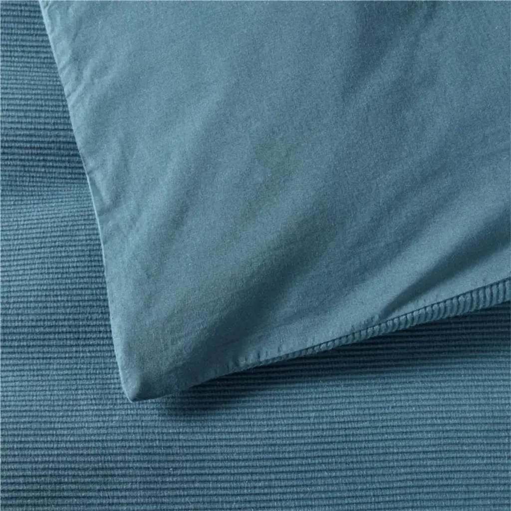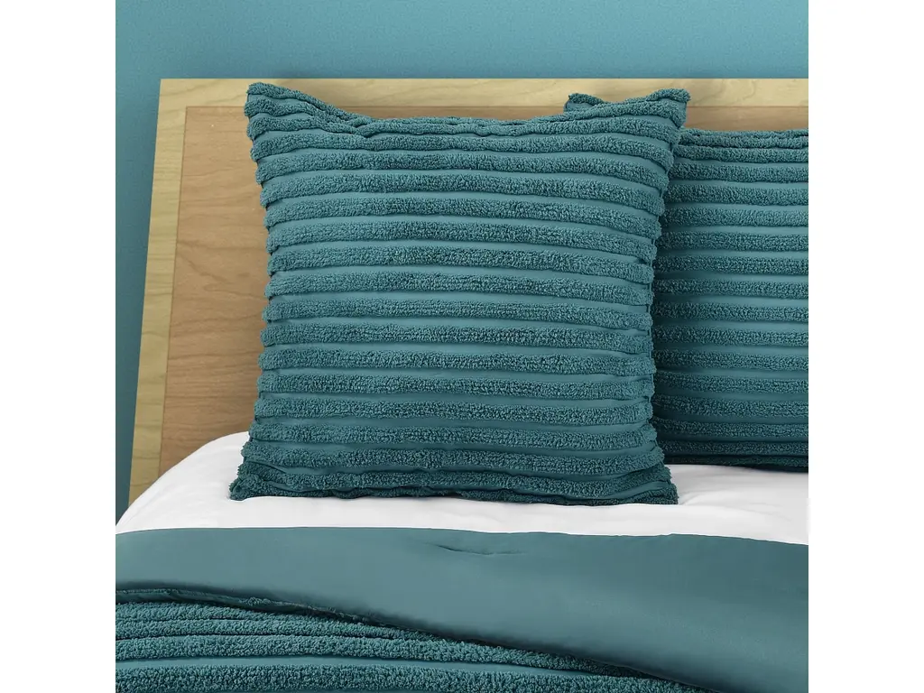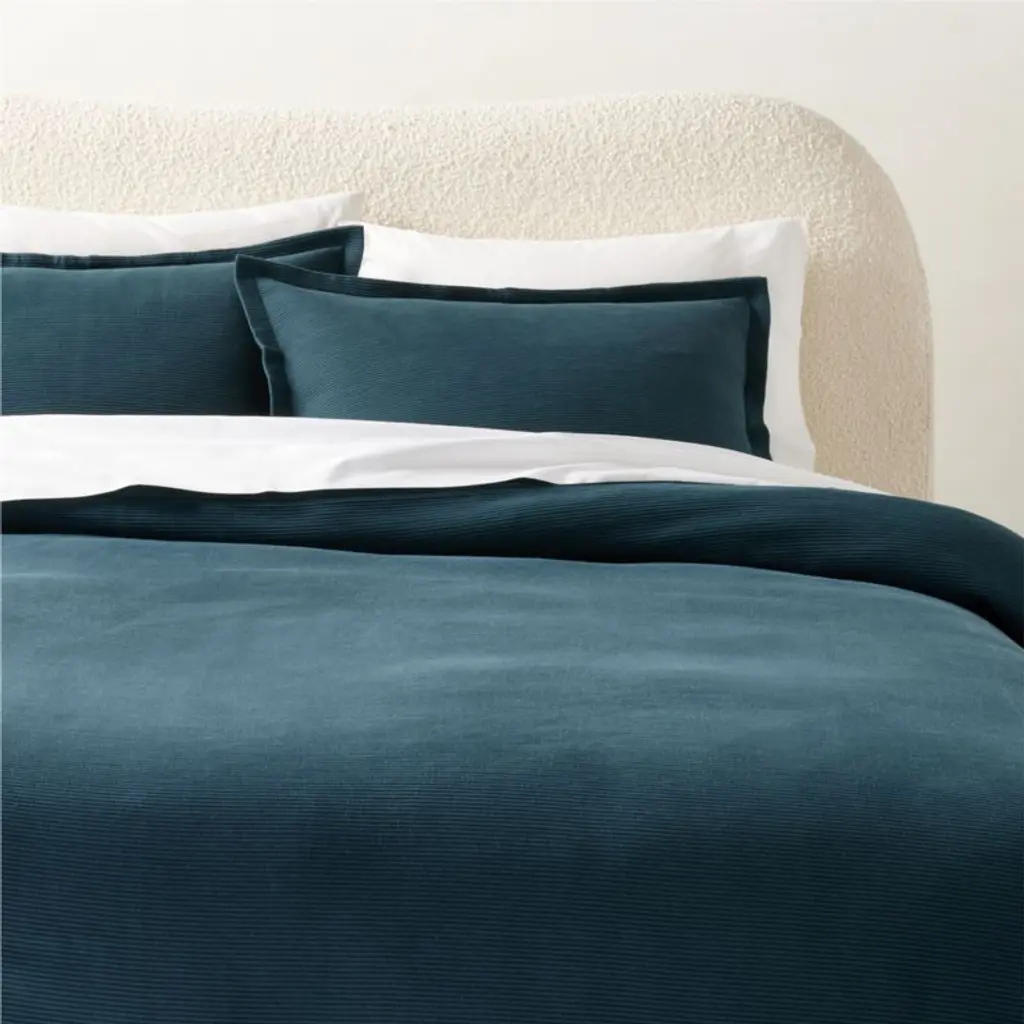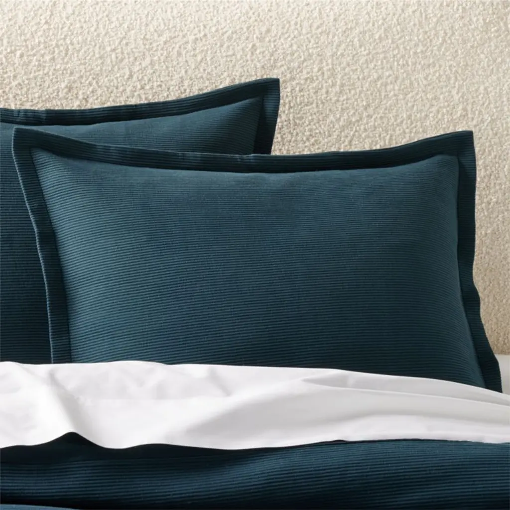 Modern matelasse pillow shams are woven of certified organic Turkish cotton for a pleasing texture. Horizontal ribbing accentuates the softness of the dark teal fabric, enveloping the bed in subdued splendor. Collection also includes duvet cover. CB2 exclusive.