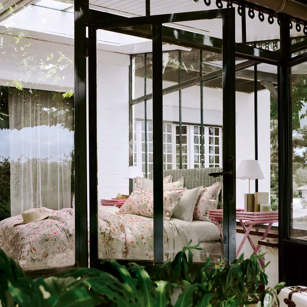 The Voyageuse Collection from Anne de Solene is a sophisticated, artistic printed design of roses and cherry blossom on a sage green ground, coordinated with a luxurious palmette print. Soft sateen adds a luxurious feel.
