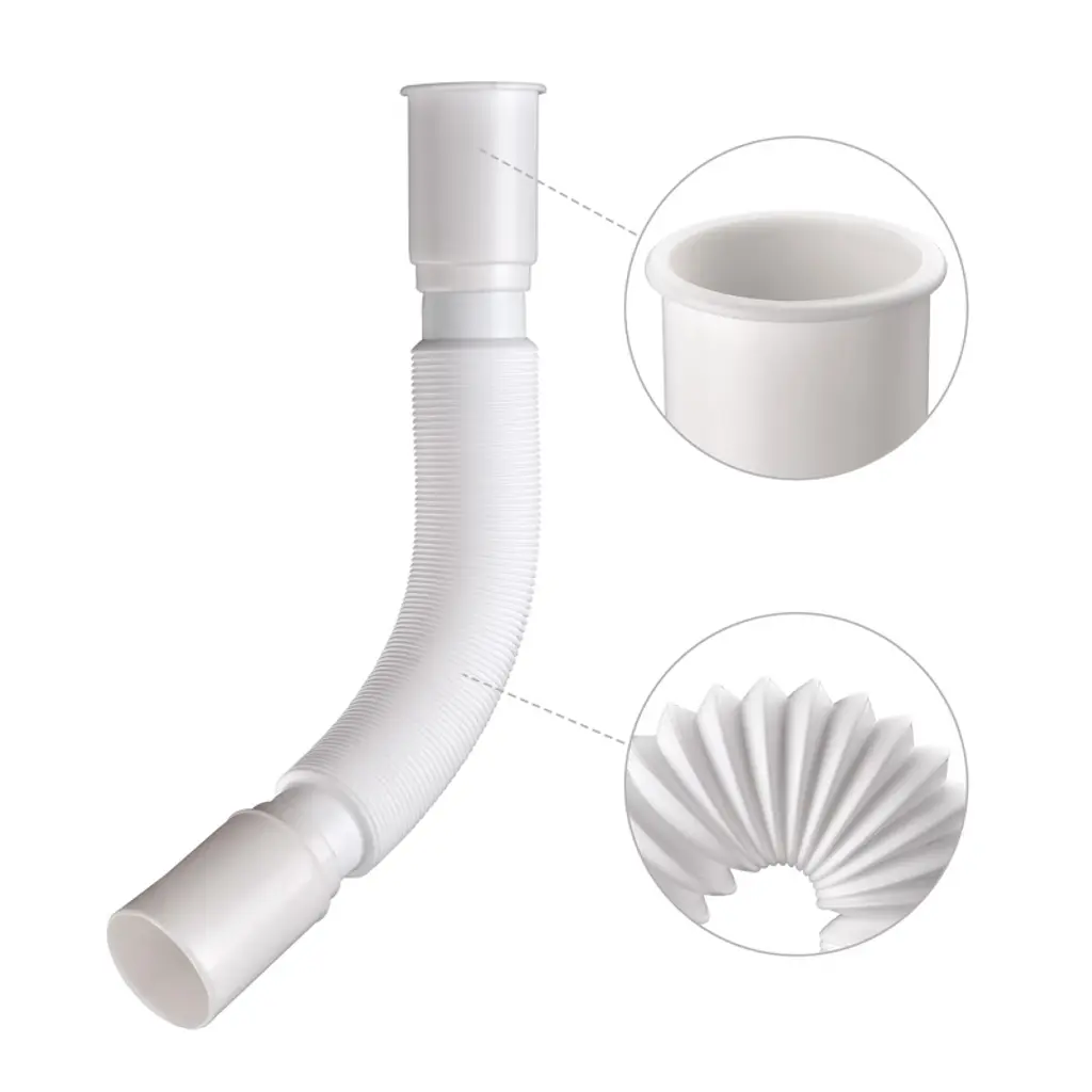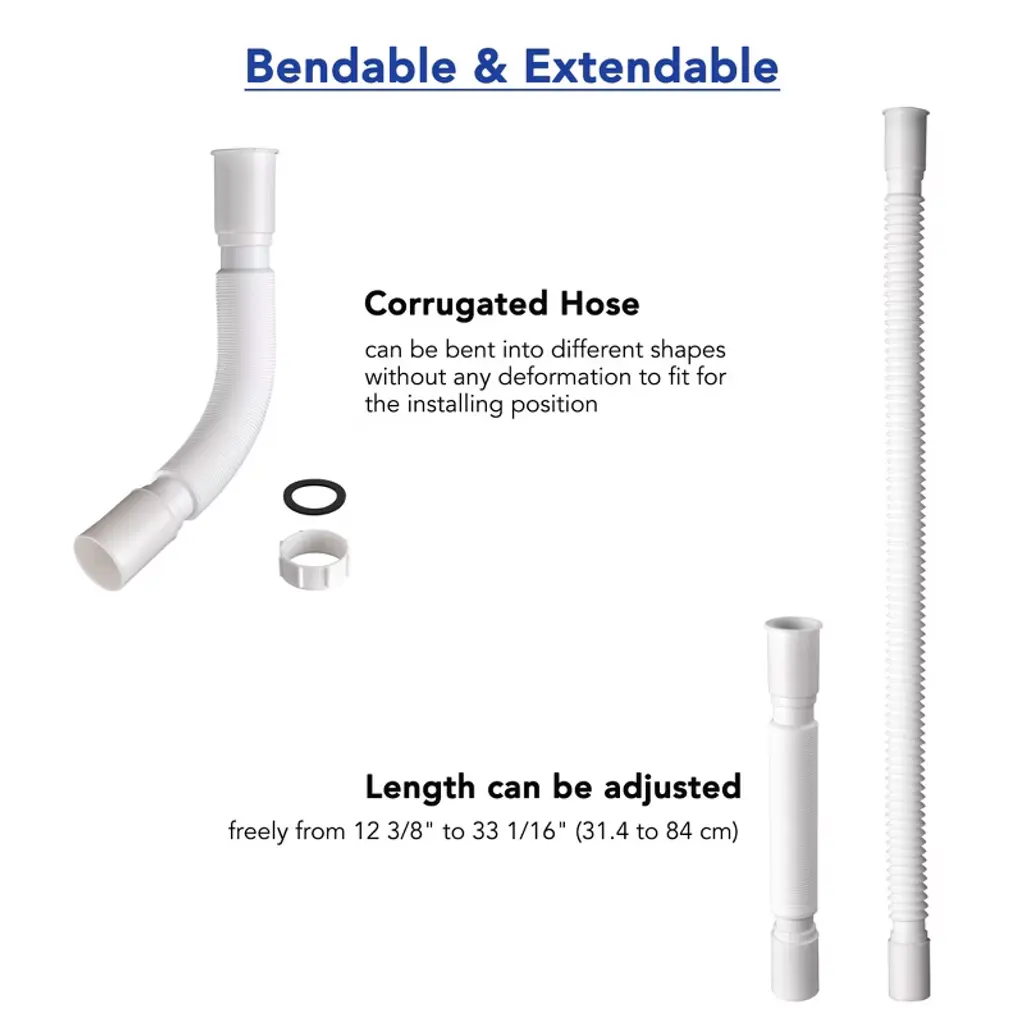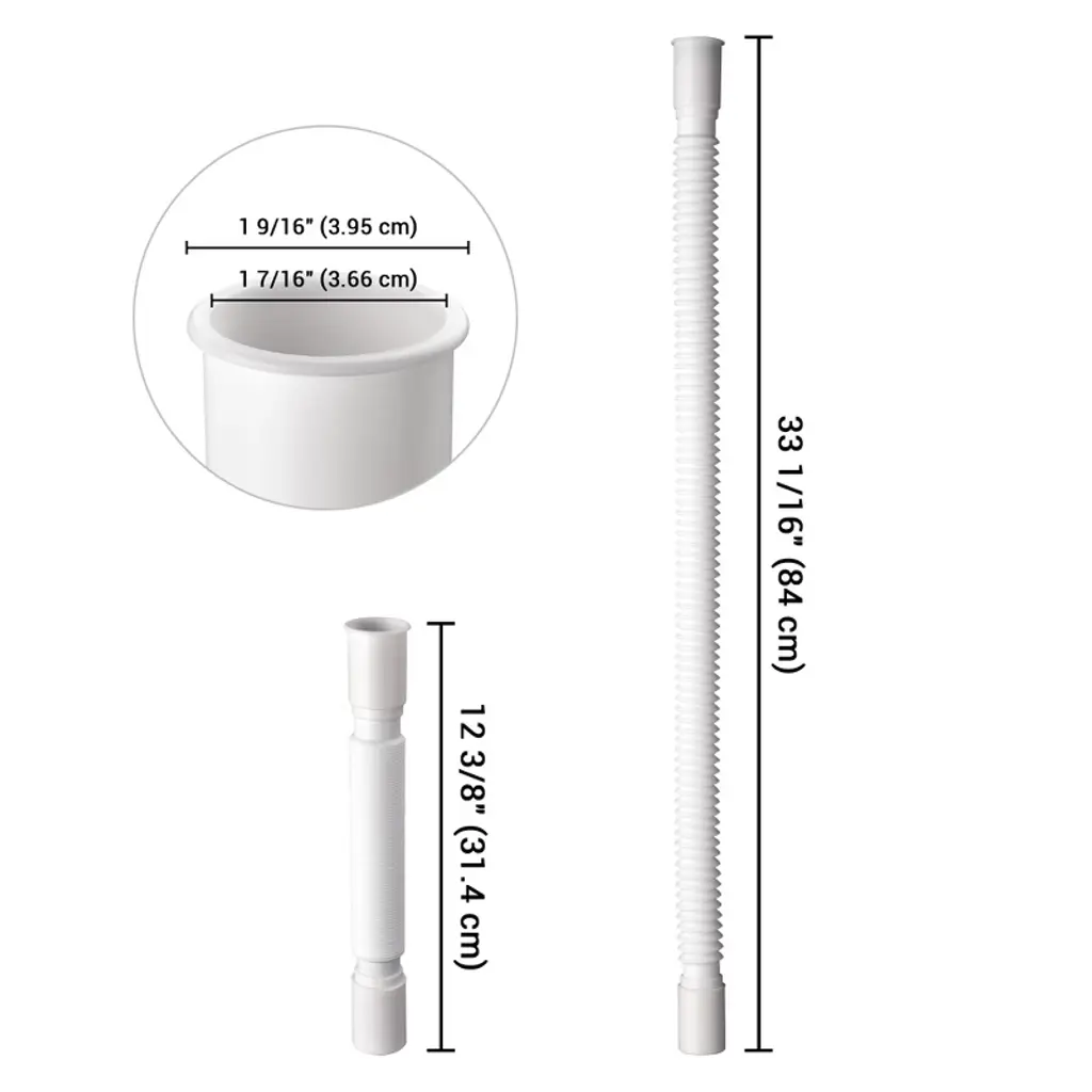 Features:- Great Compatibility - Drain hose kit includes 1 drain hose, 1 lock nut and 1 plastic gasket, a fast solution for renewing your old and broken drain hose of shampoo bowl; Compatible with our shampoo bowl model AWI049 or other drain pipes with 1 7/16" inner diameter, widely used in salon, barber shop, spa, kitchen, bathroom and more- Flexible & Bendable - Flexible corrugated hose can be bent into different shapes without any deformation to fit for the position you want to install- Expanding Length - Featuring extendable design, the length can be adjusted freely from 12 3/8" to 33 1/16" according to your need- Durable Material - Made of PP plastic, the drain hose is rust-resistant, corrosion-proof and odor-resistant for long time use in humid environment- Easy Installation - No tools needed, just connect the drain hose to the bottom of the drainer and ensure the gasket is in the hose before installingSpecifications:- Overall Length: 12 3/8" to 33 1/16" (31.4 to 84 cm)- Water Inlet Inner Diameter: 1 7/16" (3.66 cm)- Water Inlet Outer Diameter: 1 9/16" (3.95 cm)- Material: PP- Net Weight: 0.42 Lb (0.19 kg)Package Contents:- 1x Drain Hose- 1x Lock Nut- 1x Plastic Gasket