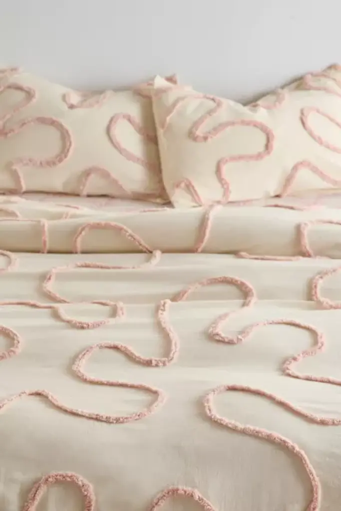 The textural pillow shams of our dreams, the Wiggle Tufted Sham Set adds an eye-catching playful layer to your bed. Made with gauzy cotton, these pillow shams feature tufted wiggles strewn across the top. Pair it with our other Wiggle Tufted Duvet Cover for a coordinated look. Pilling and tufting fall out may occur over time due to natural wear. Available exclusively at Urban Outfitters. **Features** \- Wiggle Tufted pillow shams from UO Home in gauzy cotton \- Finished with wiggly lines allover the top \- Backed with a solid cotton panel \- Envelope closure at the solid back for easy removal \- An eco-friendly upgrade, this item is OEKO-TEX® Standard 100 certified free of harsh chemicals \- UO exclusive **Content + Care** \- Includes 2 shams \- Pillow inserts sold separately \- 100% Cotton \- OEKO-TEX® Standard 100 Certified \- Meets OEKO-TEX® Standard 100 guidelines which independently test each component for harmful substances for textiles you can trust \- Machine wash cold inside out \- Imported **Size** Standard \- Dimensions: 21"l x 27"w King \- Dimensions: 20"l x 36"w