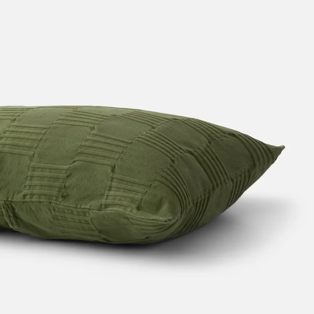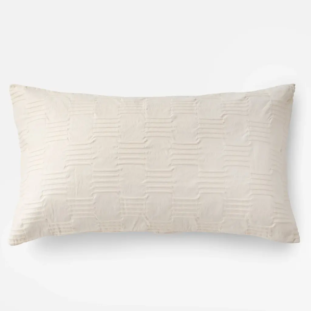 For soft texture that leans monochromatic, look to the Woven Tally Pillow Sham. The patterned jacquard front has modern lines inspired by louvered doors and windows, creating a matelassé look. On the back, percale cotton gives it a soft and crisp feel.