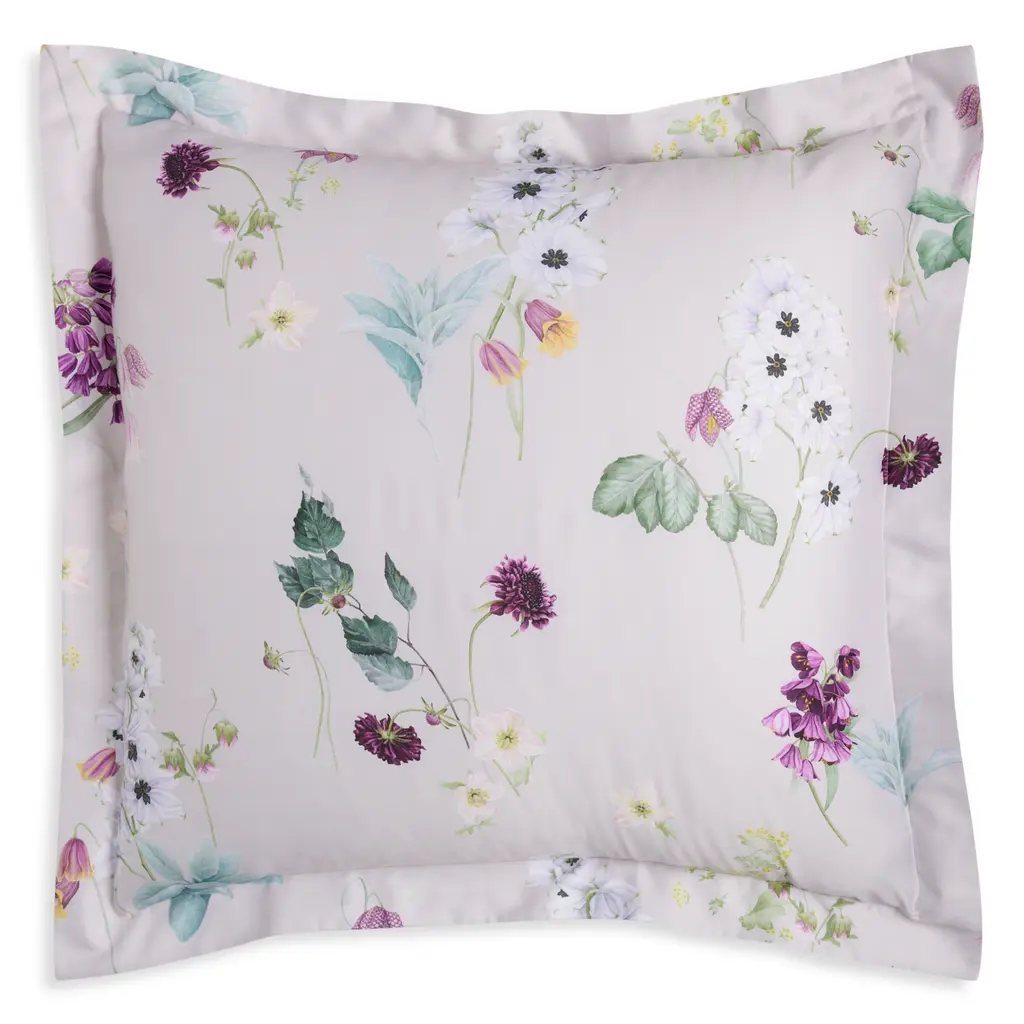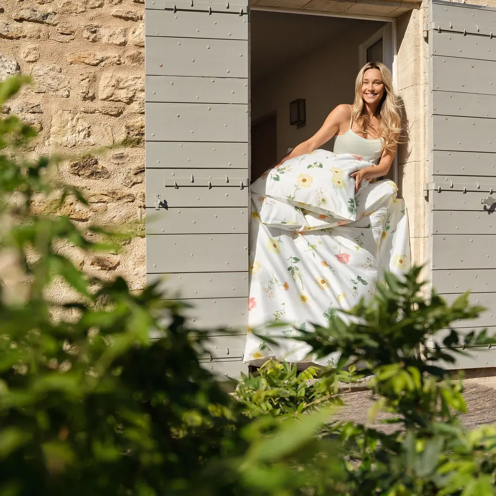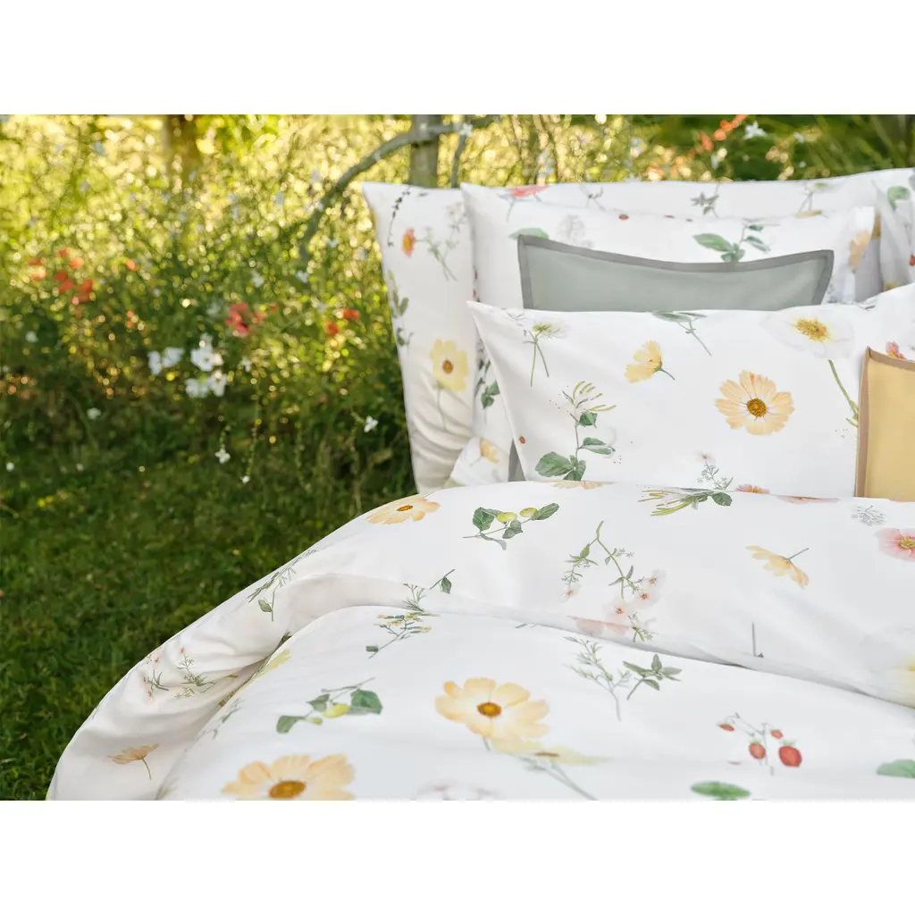 Orange zinnias and tulips, cosmea in delicate lemon yellow and a hint of apricot, salmon-colored nasturtium, beige phlox, tobacco blossoms in vanilla yellow, honeysuckle, white-lemon poppies, white lilac, small light green ornamental apples, wild strawberries in bright red. Bring a summer vibe to your room with Schlossberg's Zinnia Blanc Bedding Collection, an explosion of color on smooth sateen.