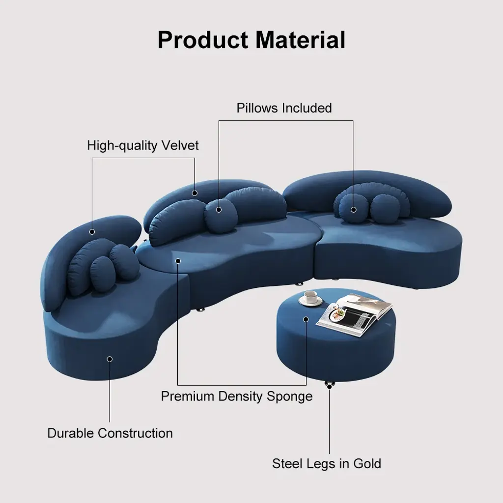 146" 4-Piece Curved Velvet Sectional Sofa With Ottoman & Pillows