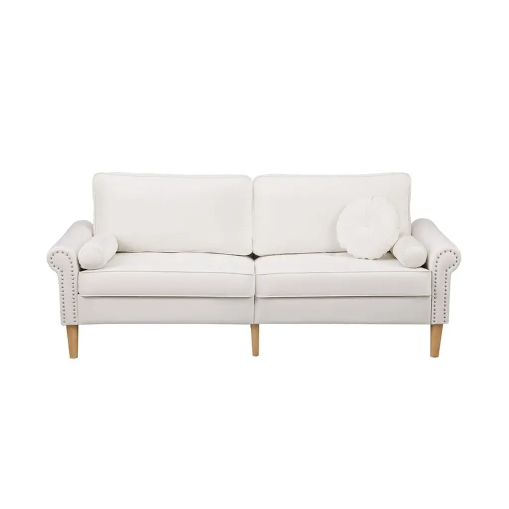 [Contemporary Style] The perfect pick for meeting your aesthetic needs, this set features a contemporary look and a streamlined silhouette. Button tufting along arms and seat back gives a nod to the classic look, but the circular arc arms with trim make this a truly modern sofa.[Ultimate Comfort] Upholstered with velvety soft velvet in a neutral hue for an inviting look, this set will provide you with unrivaled comfort. High resilience sponge cushioning reinforced with spring package will support your body when seated, and easily restore their shape.[Unique Looks Arms] Both two armrest surface inlaid copper nail which can be better integrated into the modern style.[Solid wood legs] This product comes with rubber wood sofa legs, which has a stable and strong feel, highlighting its quality.[Easy assembly] Requires simple assembly, instructions and tool kit included.