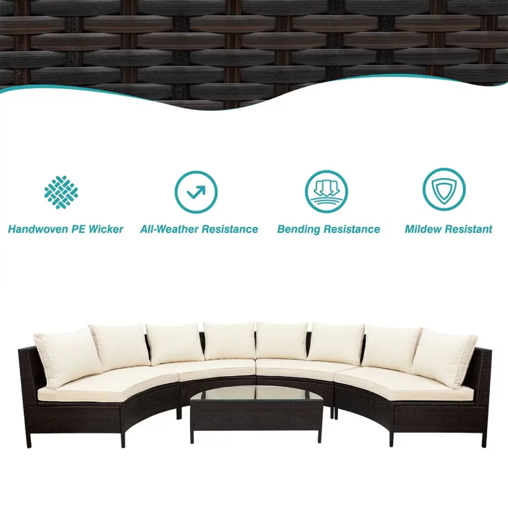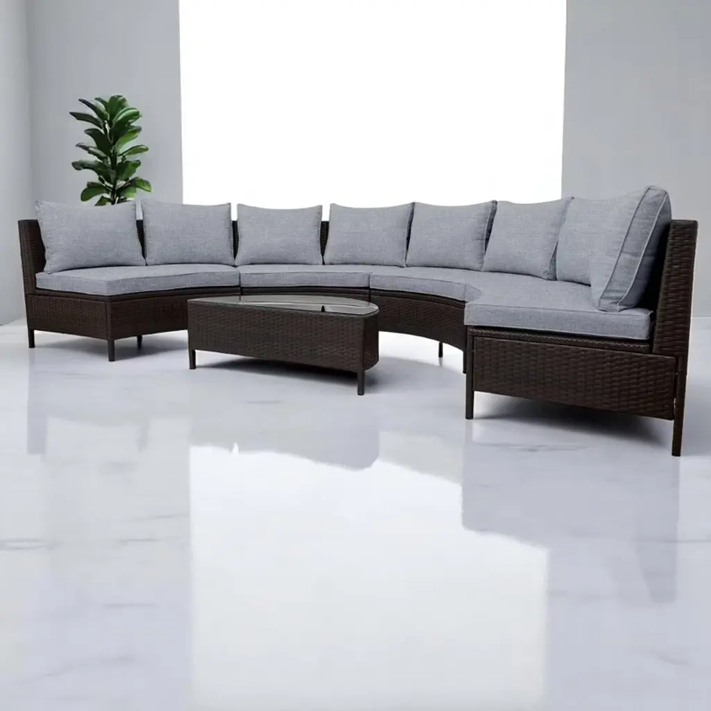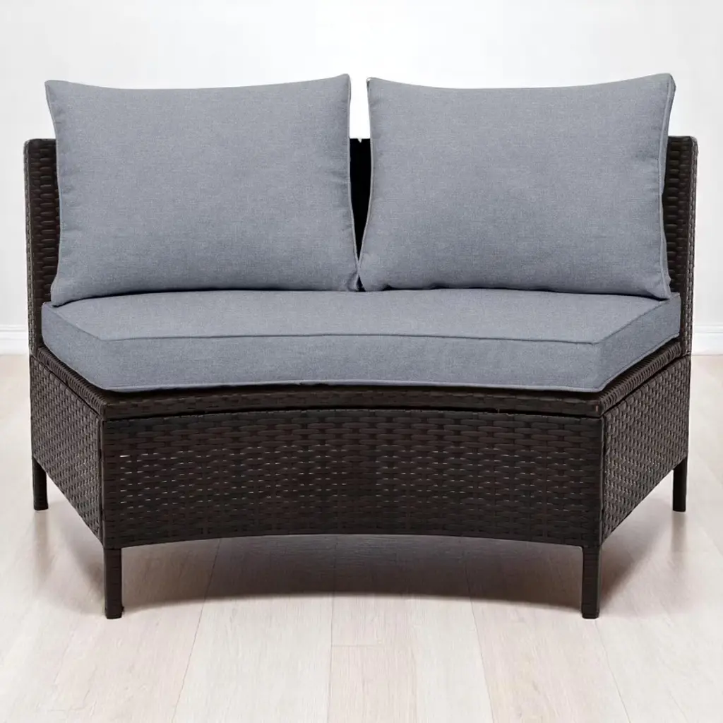 Product Overview Upgrade your outdoor living space with this 5-piece rattan sectional sofa set, designed for comfort, versatility, and durability. The set includes four 2-person sofas and a stylish half-moon shaped tempered glass table, offering multiple layout configurations to suit patios, balconies, gardens, or poolside areas. Built with a strong steel frame and wrapped in weather-resistant PE rattan, this set is made to endure UV exposure and moisture, ensuring year-round usability. Product Features Comfort is a priority with this set, featuring 2.8-inch thick cushions and plush pillows for enhanced relaxation. Cushion covers are removable and washable, making it easy to maintain a clean and fresh look. The modular design allows for a flexible setup, whether you prefer a circular arrangement or separate units for more individual seating. The half-moon coffee table includes a sturdy tempered glass top, offering a smooth, modern surface that is easy to clean and ideal for drinks, décor, or snacks. Assembly is simple, with all necessary tools included. Specifications Each Sectional Sofa: 47.6" L x 26.8" W x 27.2" H Tea Table: 37.4" L x 18.5" W x 13" H Seat Cushions: 47.6" L x 23.2" W x 2.8" T Pillows: 19.7" L x 15.7" W x 7.9" T Weight Capacity: 350 lbs per sofa seat, 176 lbs for table Materials: PE Rattan, Steel Frame, Polyester Fabric, High-Density Foam (1.7 lbs/cu.ft), Tempered Glass Color: Brown Rattan with Gray Cushions Assembly Required: Yes (tools included) Country of Origin: Vietnam Suitable Scenarios This stylish and functional rattan sofa set is ideal for hosting gatherings, relaxing outdoors, or enjoying a quiet morning coffee. Perfect for patios, balconies, gardens, or poolside areas. Customize the layout to match your outdoor space and lifestyle. Notes Manual measurements may vary slightly. Colors may appear different depending on lighting and screen display. Please follow assembly instructions carefully and avoid overtightening screws to prevent damage. For prolonged product life, it is recommended to cover or store cushions and pillows during inclement weather.