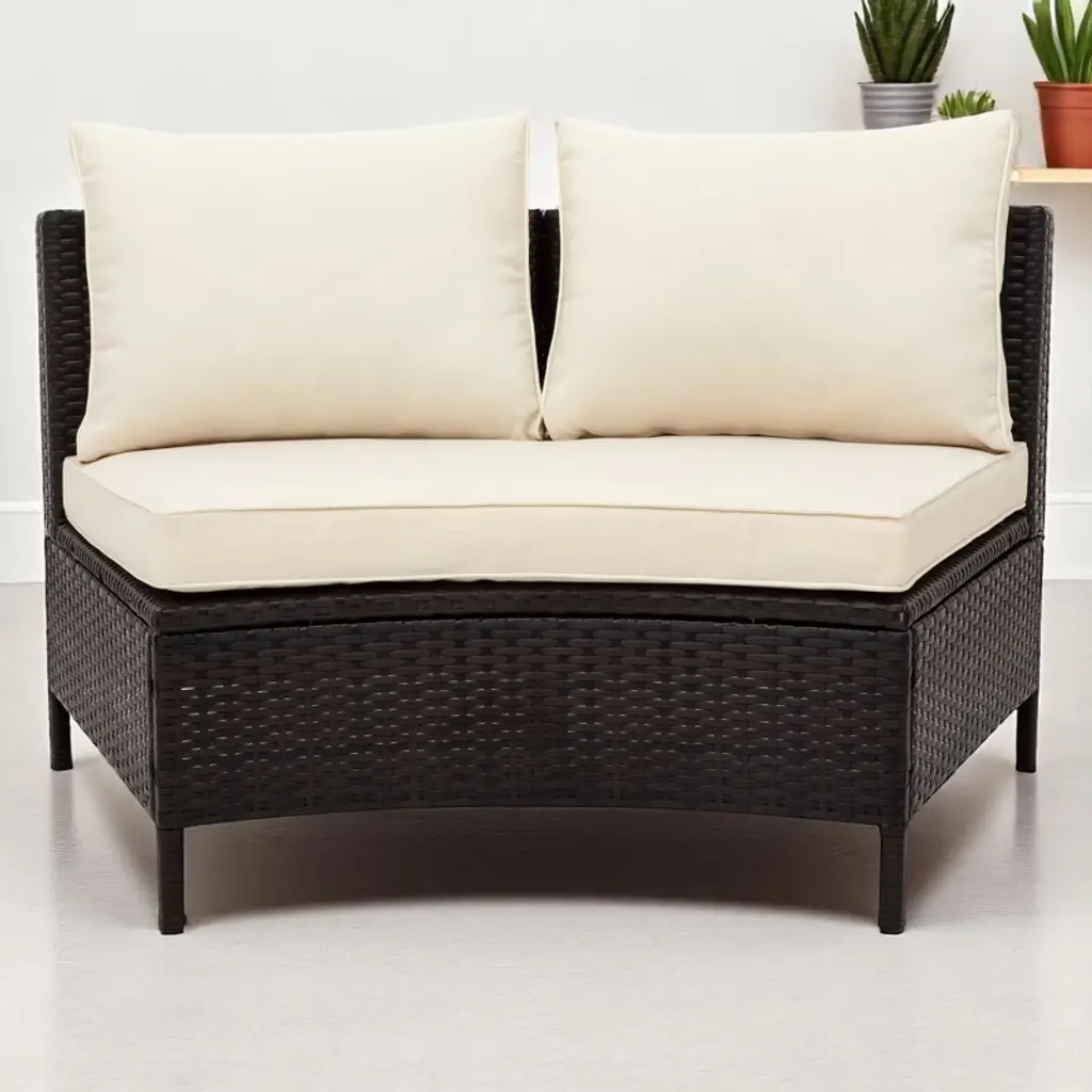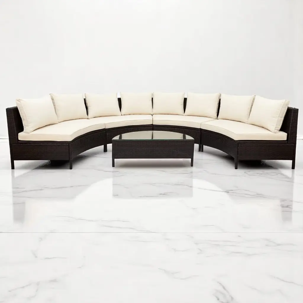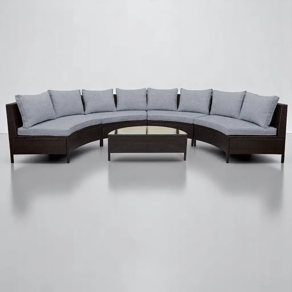 Product Overview Upgrade your outdoor living space with this 5-piece rattan sectional sofa set, designed for comfort, versatility, and durability. The set includes four 2-person sofas and a stylish half-moon shaped tempered glass table, offering multiple layout configurations to suit patios, balconies, gardens, or poolside areas. Built with a strong steel frame and wrapped in weather-resistant PE rattan, this set is made to endure UV exposure and moisture, ensuring year-round usability. Product Features Comfort is a priority with this set, featuring 2.8-inch thick cushions and plush pillows for enhanced relaxation. Cushion covers are removable and washable, making it easy to maintain a clean and fresh look. The modular design allows for a flexible setup, whether you prefer a circular arrangement or separate units for more individual seating. The half-moon coffee table includes a sturdy tempered glass top, offering a smooth, modern surface that is easy to clean and ideal for drinks, décor, or snacks. Assembly is simple, with all necessary tools included. Specifications Each Sectional Sofa: 47.6" L x 26.8" W x 27.2" H Tea Table: 37.4" L x 18.5" W x 13" H Seat Cushions: 47.6" L x 23.2" W x 2.8" T Pillows: 19.7" L x 15.7" W x 7.9" T Weight Capacity: 350 lbs per sofa seat, 176 lbs for table Materials: PE Rattan, Steel Frame, Polyester Fabric, High-Density Foam (1.7 lbs/cu.ft), Tempered Glass Color: Brown Rattan with Gray Cushions Assembly Required: Yes (tools included) Country of Origin: Vietnam Suitable Scenarios This stylish and functional rattan sofa set is ideal for hosting gatherings, relaxing outdoors, or enjoying a quiet morning coffee. Perfect for patios, balconies, gardens, or poolside areas. Customize the layout to match your outdoor space and lifestyle. Notes Manual measurements may vary slightly. Colors may appear different depending on lighting and screen display. Please follow assembly instructions carefully and avoid overtightening screws to prevent damage. For prolonged product life, it is recommended to cover or store cushions and pillows during inclement weather.