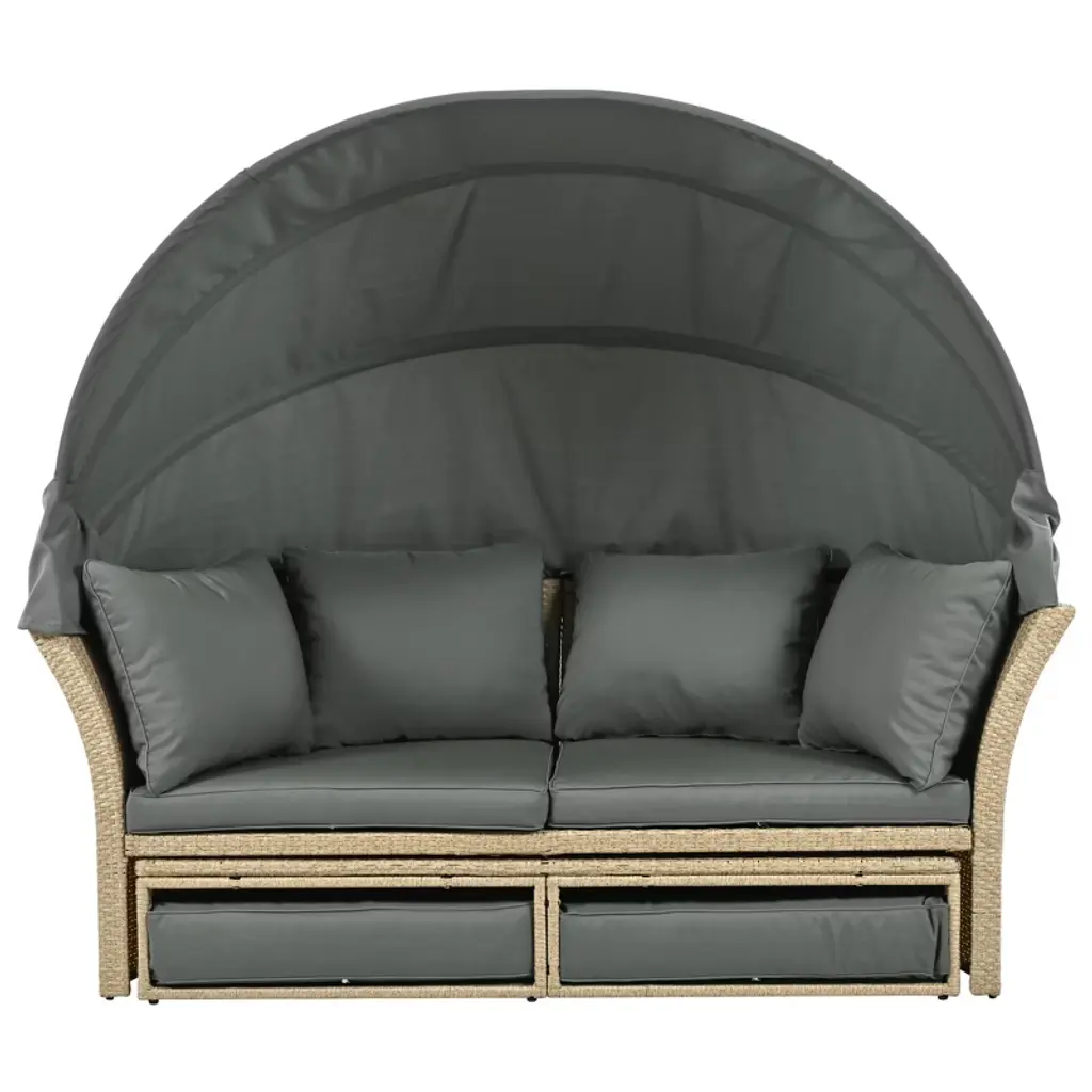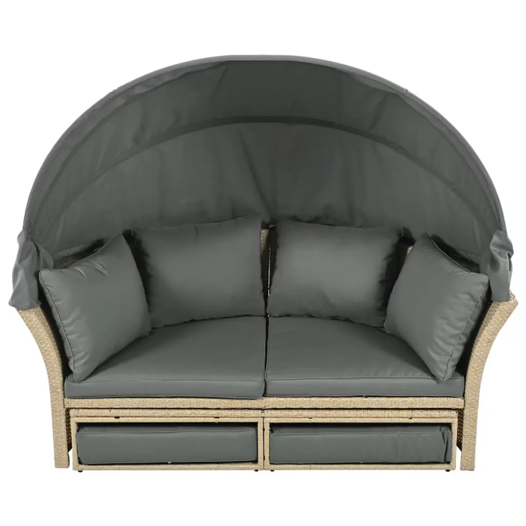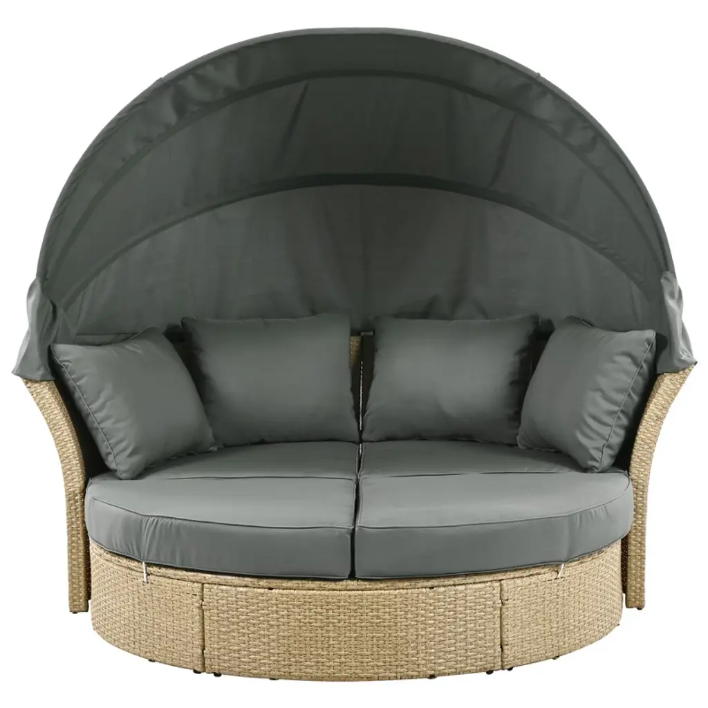 Convertible Outdoor Patio Daybed ¨C Versatility Meets Luxury Upgrade your outdoor living with this beautifully designed convertible patio daybed. Whether you¡¯re relaxing solo or entertaining guests, this piece easily transforms from a cozy loveseat into a spacious daybed. The sleek design, plush cushions, and retractable canopy make it a standout feature for any patio, garden, or poolside setting. Product Features Convertible Patio Daybed: Effortlessly switch between a loveseat and a daybed. The rotating platform and flip-up seat cushion make it simple to change configurations, offering unmatched comfort and flexibility.Retractable Canopy: Protect yourself from harsh sunlight with the adjustable canopy. It offers personalized shade control so you can enjoy your outdoor time in comfort¡ªsun or shade, your choice.Comfortable Cushions and Pillows: Soft padded cushions and four matching pillows create a luxurious lounging experience. Zippered cushion covers are removable and washable for easy care and long-lasting use.Outdoor-Ready Materials: Constructed from durable PE rattan and a sturdy iron frame, this daybed is water-resistant and weather-resistant, built to handle all seasons.Spacious and Stylish Design: With ample room for two, this large round daybed combines trendy looks with upscale comfort. Its stylish profile enhances any outdoor decor.Multi-Scene Use: Lightweight yet stable, this rattan daybed is easy to move and perfect for patios, balconies, porches, lawns, or poolside lounges. Product Dimensions & Weight Overall Dimensions: 71.7"D x 63.4"W x 62.2"HProduct Weight: 81.57 lbsWeight Capacity: 325 lbs per seat Materials & Construction Upholstery Material: PolyesterFrame Material: Iron + RattanSeat Construction: High-density FoamFoam Density: 1.3 lbs/cu.ftLeg Material: PlasticPillows Included: Yes, 4Removable Cushion & Cover: Yes Product Care Wipe with a soft-bristle brush using tepid water and mild detergent.Avoid harsh cleaners. Ensure the furniture is fully dry after exposure to moisture. Assembly Instructions Insert all screws halfway first for alignment, then tighten fully once properly positioned.Do not over-tighten to avoid potential damage to the structure. Notes All dimensions are manually measured; slight variations may occur.Color may differ slightly due to lighting or display settings. Whether you're sunbathing, napping, or entertaining, this convertible daybed is your ticket to luxury and comfort outdoors.