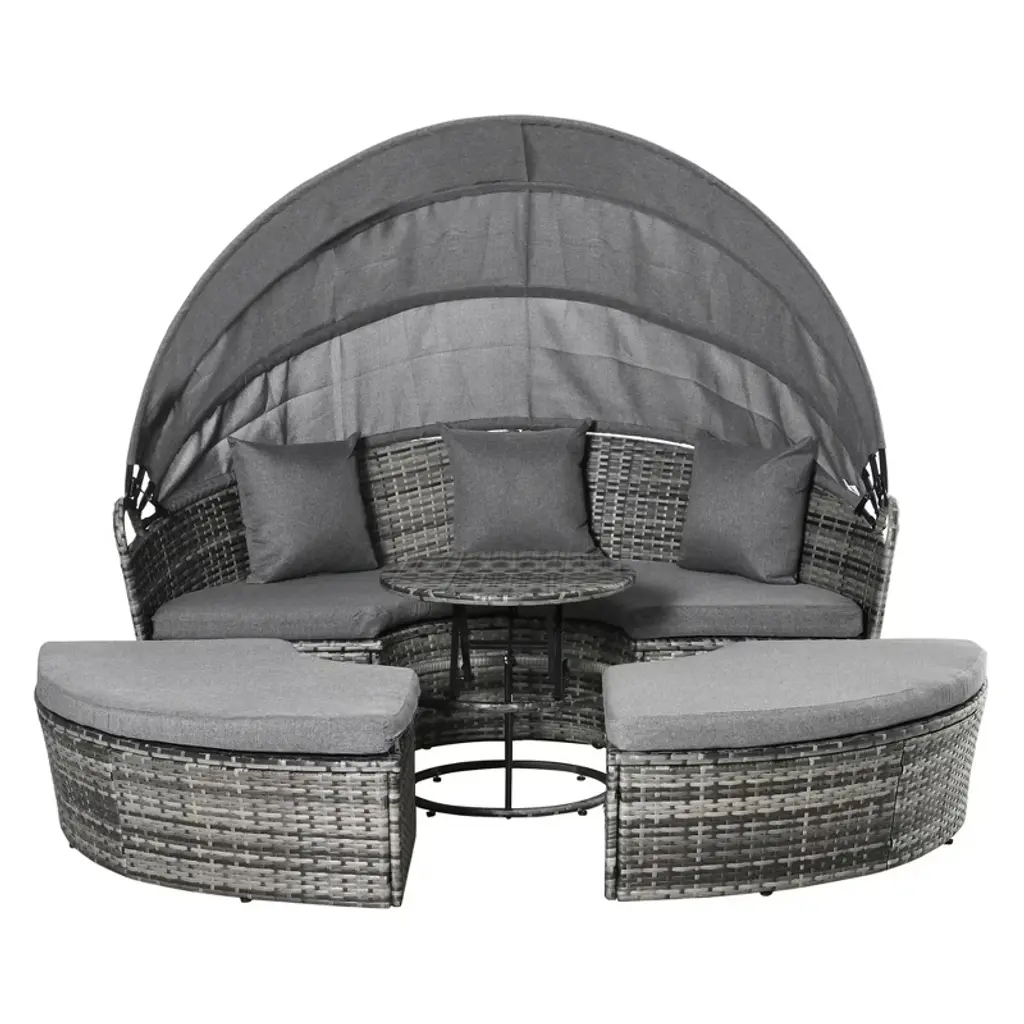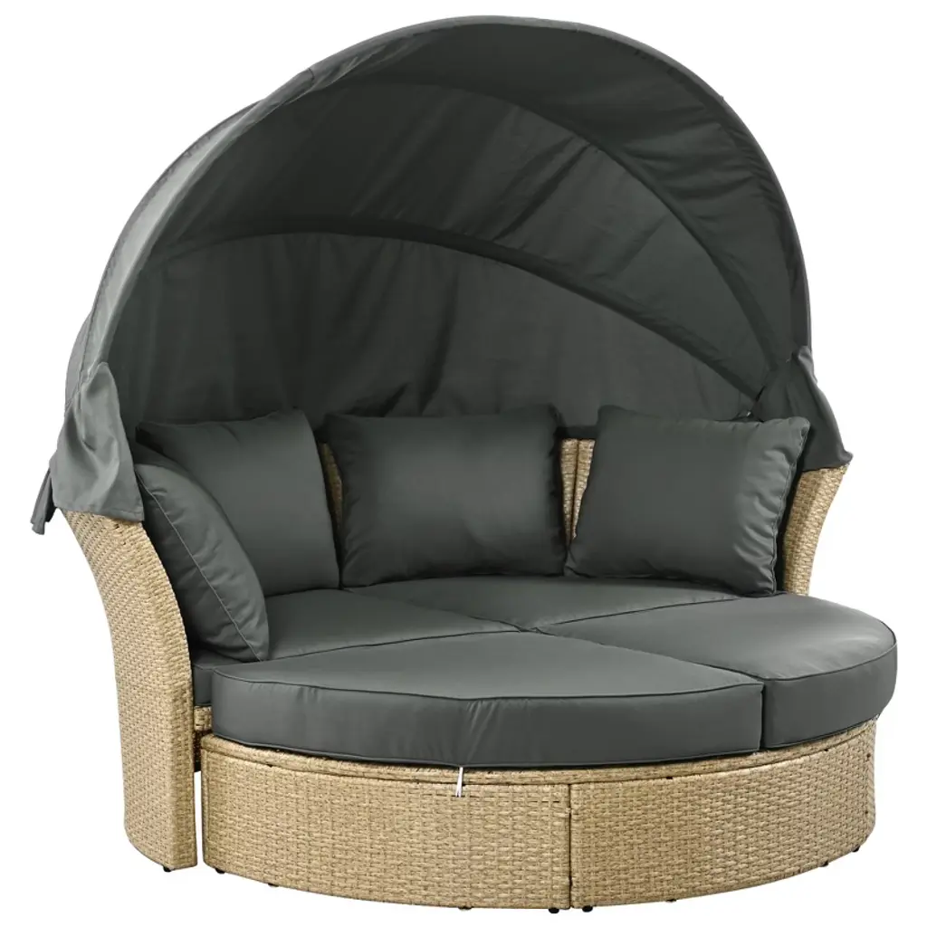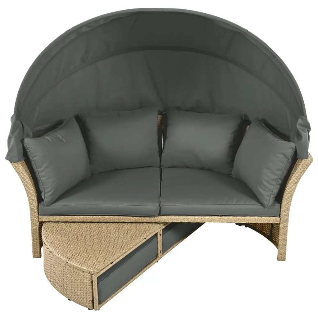 Convertible Outdoor Patio Daybed ¨C Versatility Meets Luxury Upgrade your outdoor living with this beautifully designed convertible patio daybed. Whether you¡¯re relaxing solo or entertaining guests, this piece easily transforms from a cozy loveseat into a spacious daybed. The sleek design, plush cushions, and retractable canopy make it a standout feature for any patio, garden, or poolside setting. Product Features Convertible Patio Daybed: Effortlessly switch between a loveseat and a daybed. The rotating platform and flip-up seat cushion make it simple to change configurations, offering unmatched comfort and flexibility.Retractable Canopy: Protect yourself from harsh sunlight with the adjustable canopy. It offers personalized shade control so you can enjoy your outdoor time in comfort¡ªsun or shade, your choice.Comfortable Cushions and Pillows: Soft padded cushions and four matching pillows create a luxurious lounging experience. Zippered cushion covers are removable and washable for easy care and long-lasting use.Outdoor-Ready Materials: Constructed from durable PE rattan and a sturdy iron frame, this daybed is water-resistant and weather-resistant, built to handle all seasons.Spacious and Stylish Design: With ample room for two, this large round daybed combines trendy looks with upscale comfort. Its stylish profile enhances any outdoor decor.Multi-Scene Use: Lightweight yet stable, this rattan daybed is easy to move and perfect for patios, balconies, porches, lawns, or poolside lounges. Product Dimensions & Weight Overall Dimensions: 71.7"D x 63.4"W x 62.2"HProduct Weight: 81.57 lbsWeight Capacity: 325 lbs per seat Materials & Construction Upholstery Material: PolyesterFrame Material: Iron + RattanSeat Construction: High-density FoamFoam Density: 1.3 lbs/cu.ftLeg Material: PlasticPillows Included: Yes, 4Removable Cushion & Cover: Yes Product Care Wipe with a soft-bristle brush using tepid water and mild detergent.Avoid harsh cleaners. Ensure the furniture is fully dry after exposure to moisture. Assembly Instructions Insert all screws halfway first for alignment, then tighten fully once properly positioned.Do not over-tighten to avoid potential damage to the structure. Notes All dimensions are manually measured; slight variations may occur.Color may differ slightly due to lighting or display settings. Whether you're sunbathing, napping, or entertaining, this convertible daybed is your ticket to luxury and comfort outdoors.