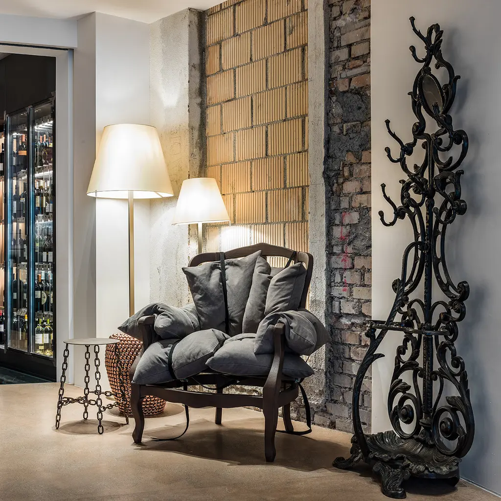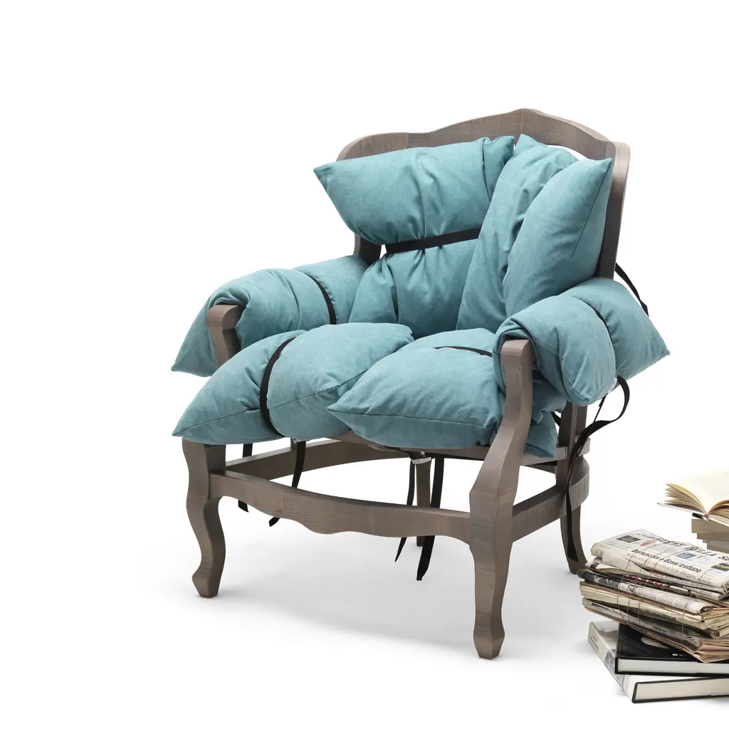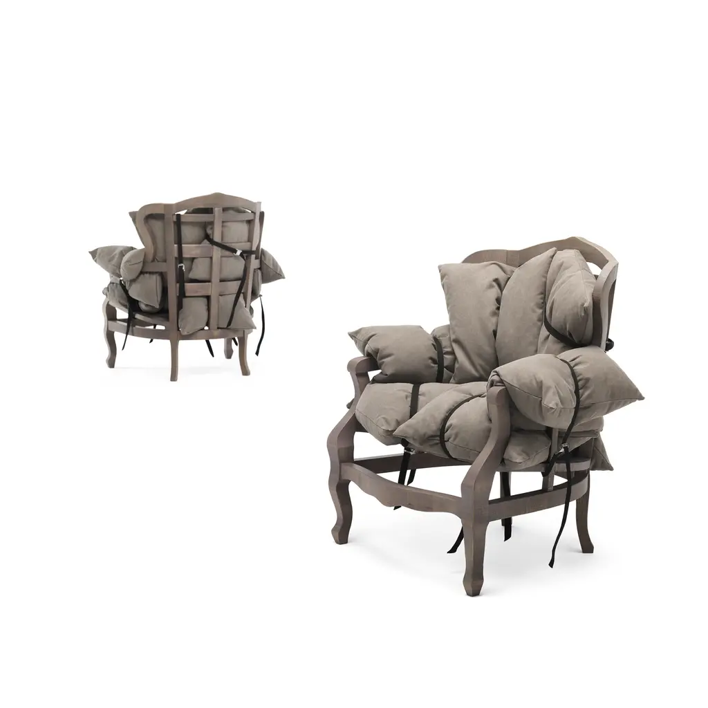 The 7 Pillows armchair is in solid beech wood, available in natural color or painted and complete with 7 feather pillows with removable cover. This project was born with a desire to create a chair that shows itself and how it is made of exquisite craft of the open structure and simplicity of the stuffing elements. The casual arrangements of the cushions fixed with straps plays a contrast to the refined wooden frame, made entirely by hand.