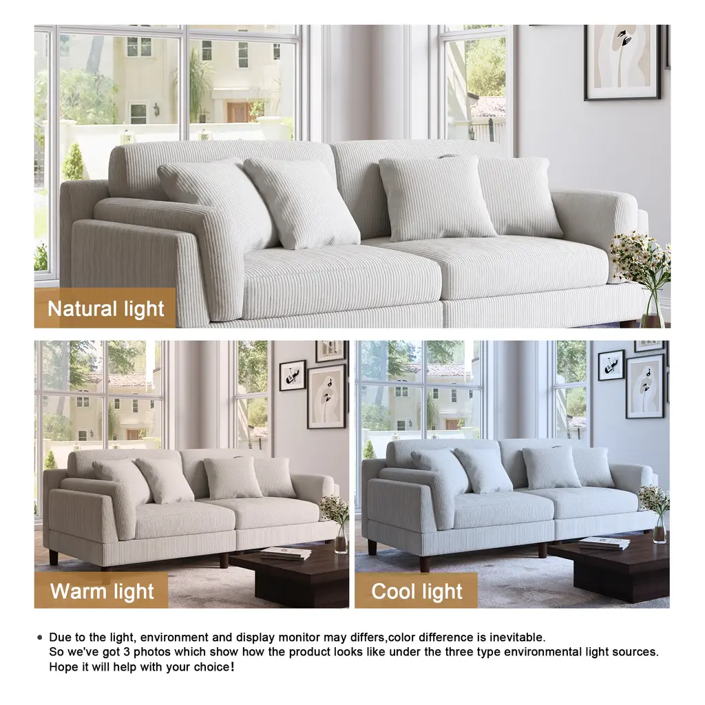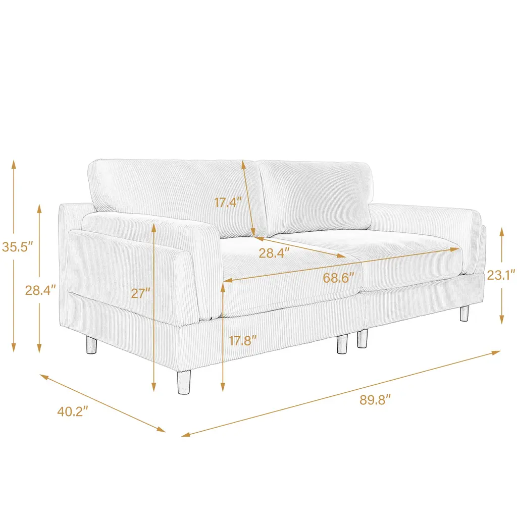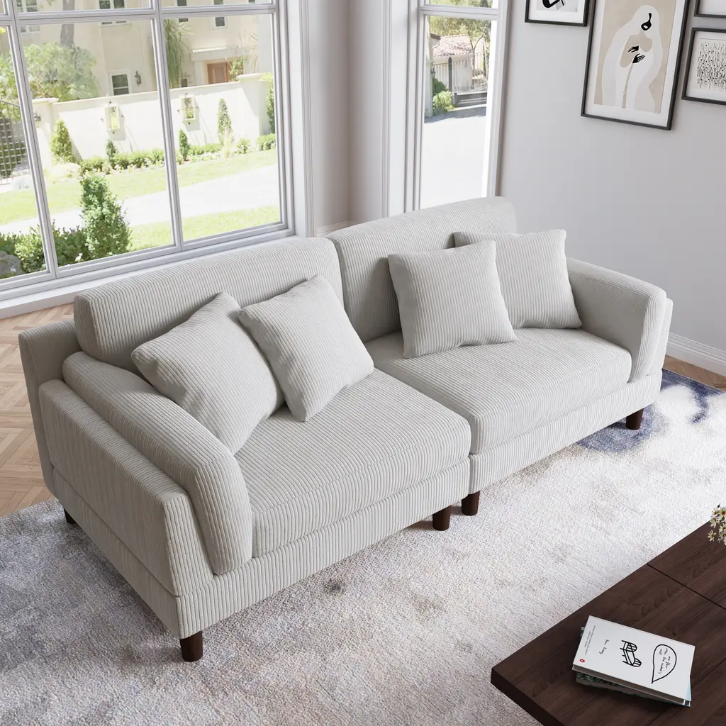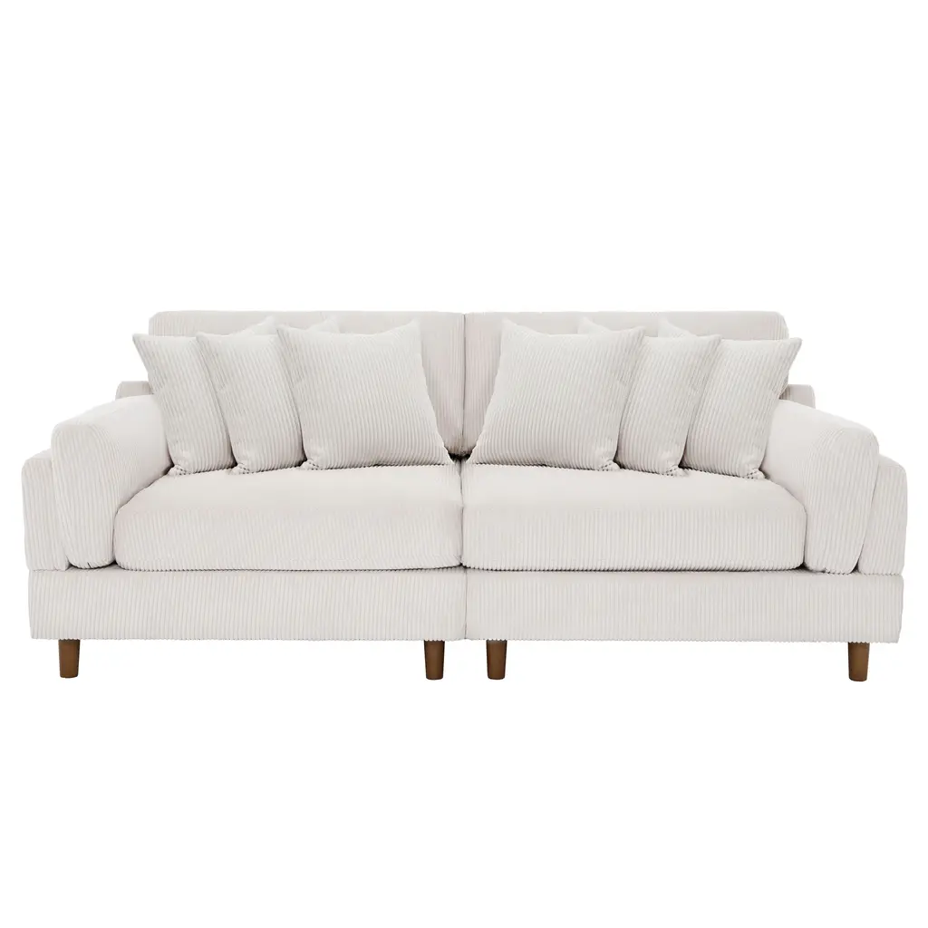 Elevate your living space with our chic corduroy sofa, a perfect blend of modern style and exceptional comfort. Featuring plush, deep seat cushions and textured corduroy upholstery, this sofa is built on a robust wooden frame with foam-filled pocket springs, offering unparalleled support and durability. Its sleek design is enhanced by tapered wooden legs with a rich brown finish, and the square arms coupled with soft, padded backrests add a touch of elegance to its contemporary look.Product informations:Highlights: