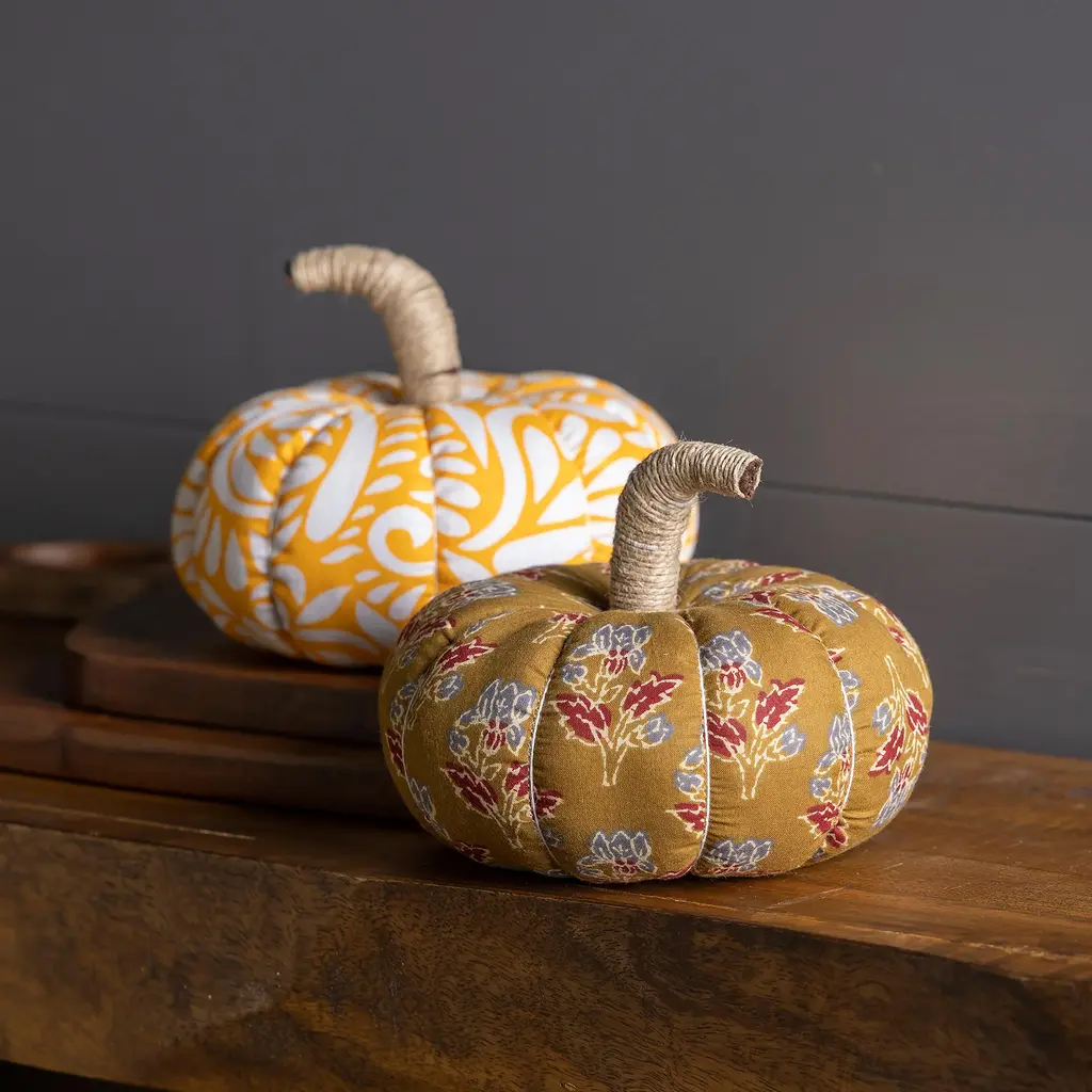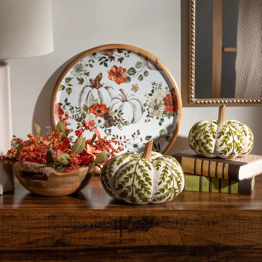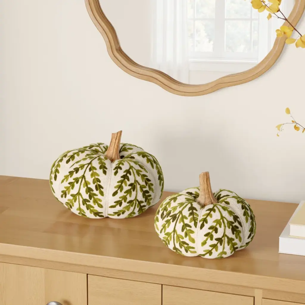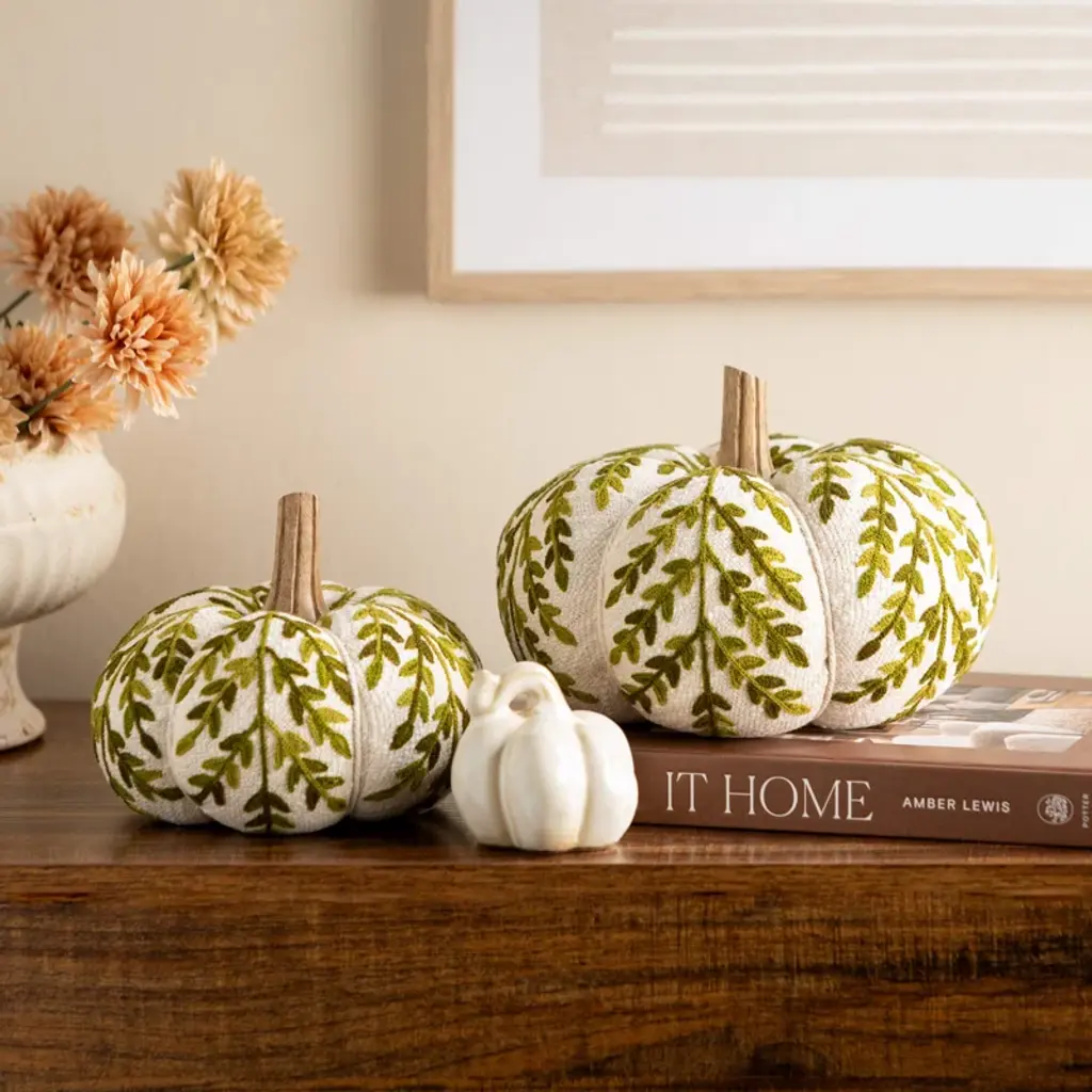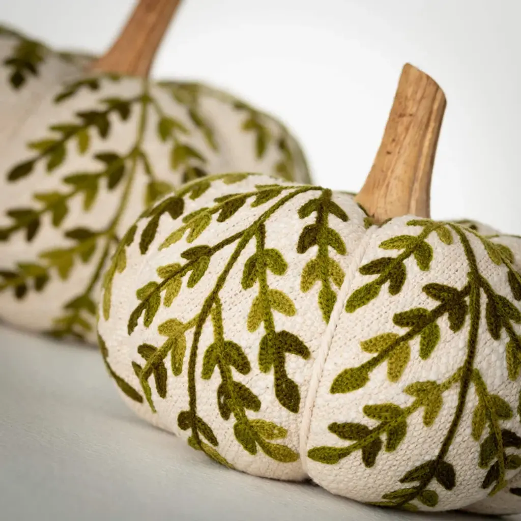 Add a touch of rustic elegance to your seasonal décor with this charming set of fabric pumpkins. Crafted from soft, neutral-toned fabric, each pumpkin is adorned with a delicate green vine embroidery pattern, creating a nature-inspired look. The realistic wooden stems give them an authentic, organic feel, making them perfect for fall displays, farmhouse accents, or year-round decorative arrangements. Their timeless design pairs effortlessly with a variety of décor styles, from modern minimalism to cozy cottage chic.