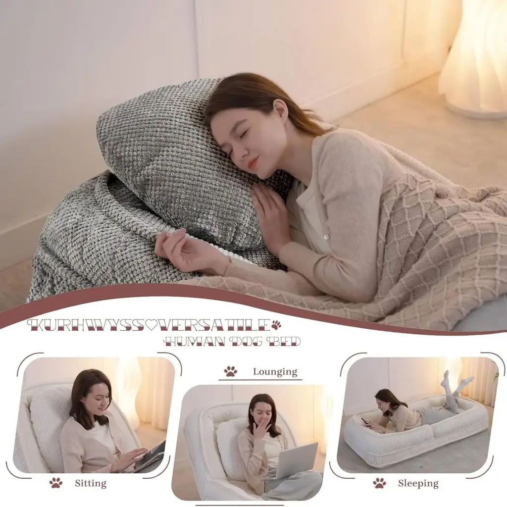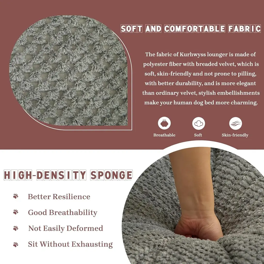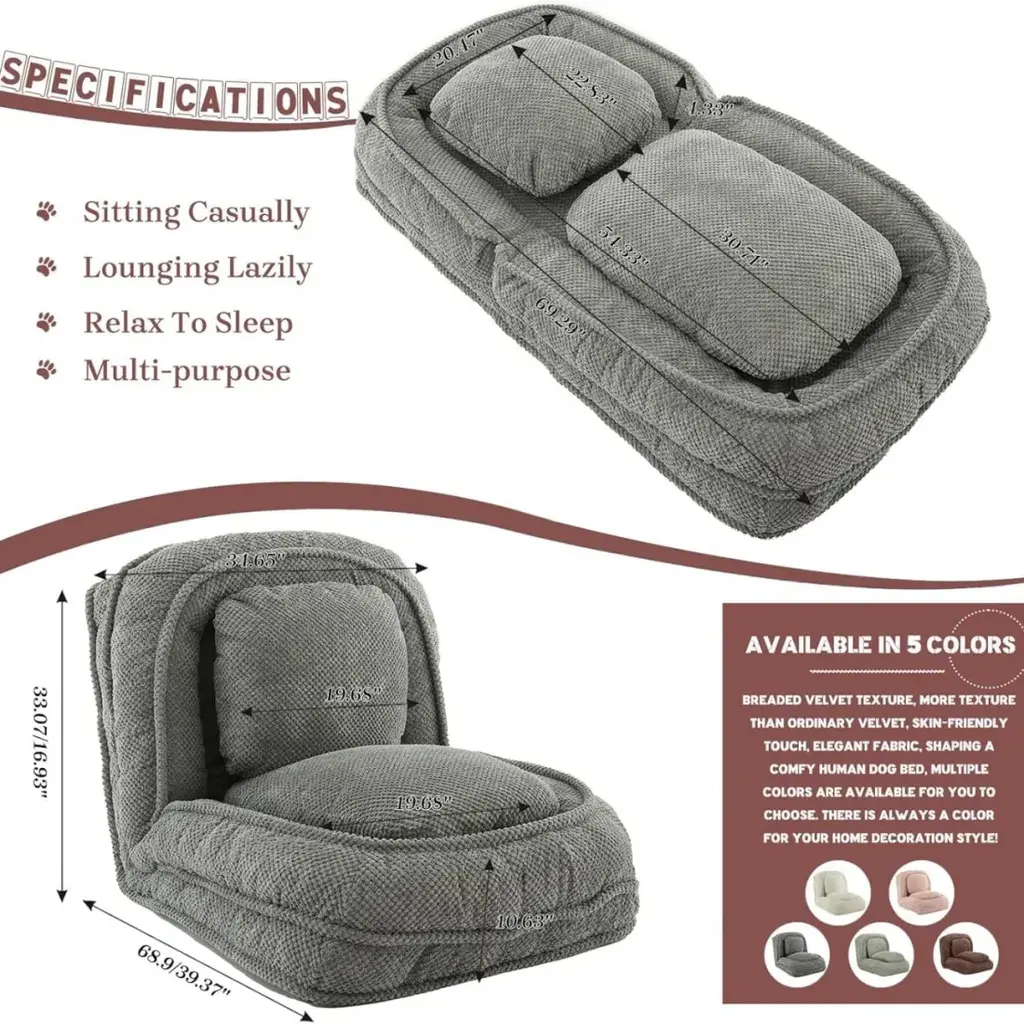 Comfortable and Relaxing Sitting Position: This dog bed for humans is filled with fluffy doll cotton and high resilience foam, the full padding can provide you with great comfort and support. The surface is covered with selected polyester fiber, which is breathable and wear-resistant. What's more, the two removable pillows can be used as pillows, backrests or sleeping pads to meet your different needs.Backrest 5 Positions Adjustment: The backrest of our bean bag bed can be adjusted in 5 different positions within the range of 90 ~ 180 degrees. The multiple-angle adjustable design allows you to adjust to a comfortable position in seconds. This folding sofa chair can be used to sit and sleep, easily meeting your various sitting needs for snoozing, reading, gaming, working, and watching TV.Widely Applies Anywhere: This multi-functional lazy dog bed can be added to any room with different décor, and the lightweight design allows you to easily move it to your desired position. Whether you put it in your bedroom, living room, dorm or home office, use it as a nap bed, lounge chair, or pet bed it is a great choice.Solid and Durable Materials: This adjustable human dog bed is made of a solid metal frame with a powder-coated finish, very solid and stable, and it can easily hold up to 350 lbs. The quality fabric and high-density foam padding are very durable, making this beanbag provide you with comfort while serving you for a longer time.Easy Assembly: The installation of this comfy lounge chair is very easy and fast. Once you receive the package you simply open the vacuum bag, place the metal frame in it, and wait for the natural bounce for 72 hours to enjoy the comfort and relaxation that this convertible sofa chair gives you.Notice: All colors on our website are for reference only, actual product colors may vary a little bit, due to different colour settings of every screen device. Most of our sofas are hand-measured, therefore the dimensions are for reference only, and may marginally deviate.