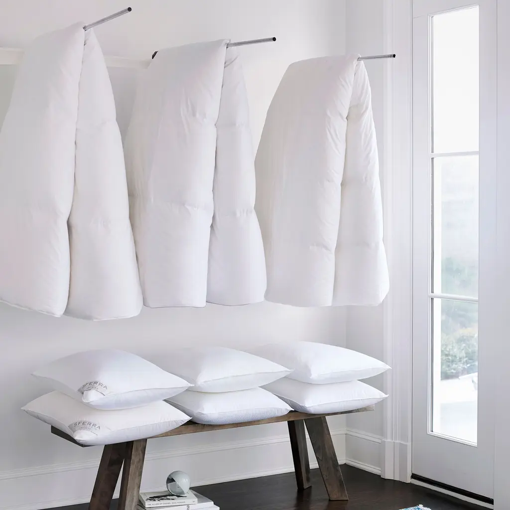 This special Sferra Bros. Ltd. king duvet crosses the thermal insulating properties of featherweight down with the easy-care attributes of modern techno-fibers. A baffled construction allows room for the hypoallergenic 100-percent micro-fiber fill to breathe, keeping it fresher and helping to maintain the fills warming properties. Sleek 330 thread count all-cotton sateen shell with double-stitched piping, available only in crisp white, of course. Easy to wash and dry.