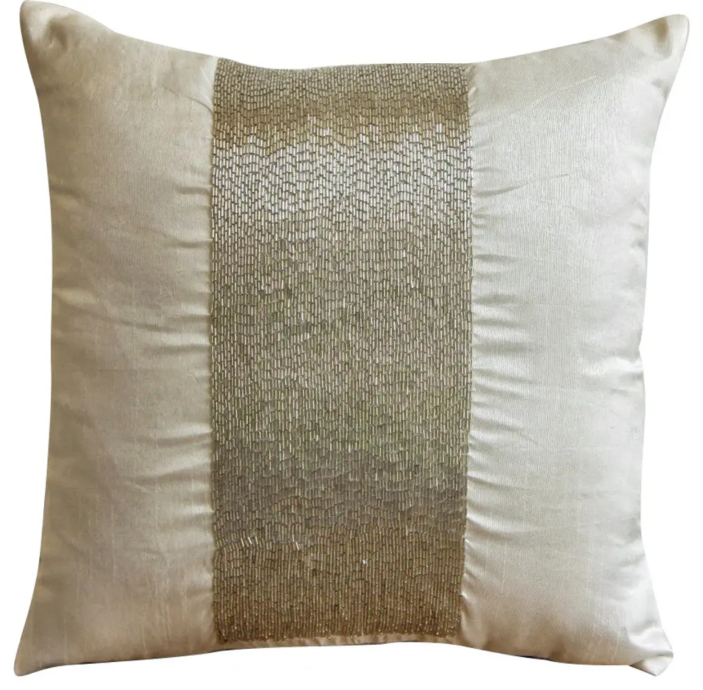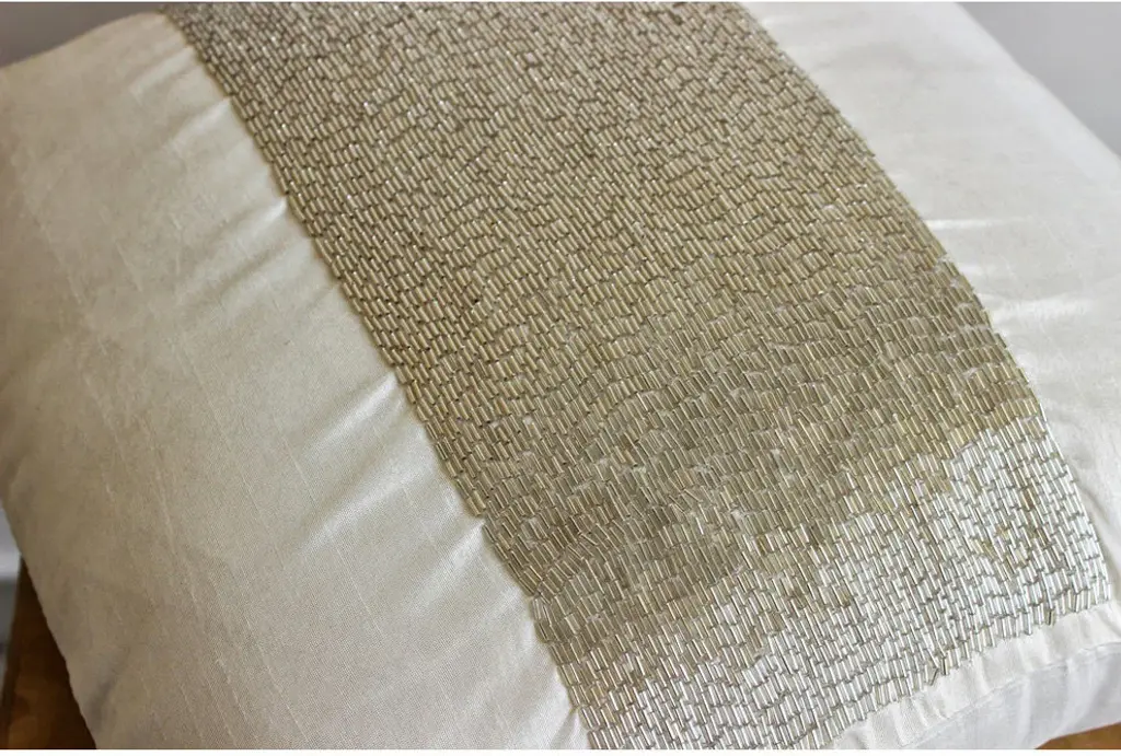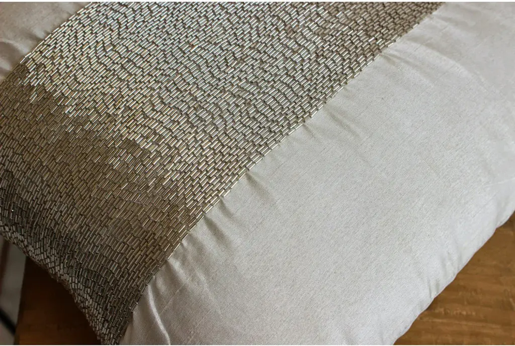 Art Silk Bed Lounge Pillow White 20"x20" Beaded Center Band, White Sparkle