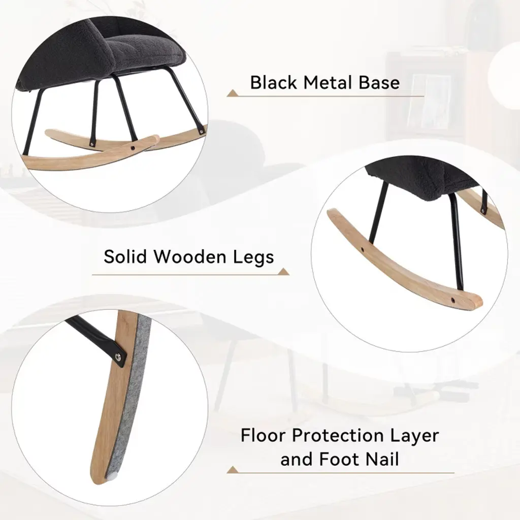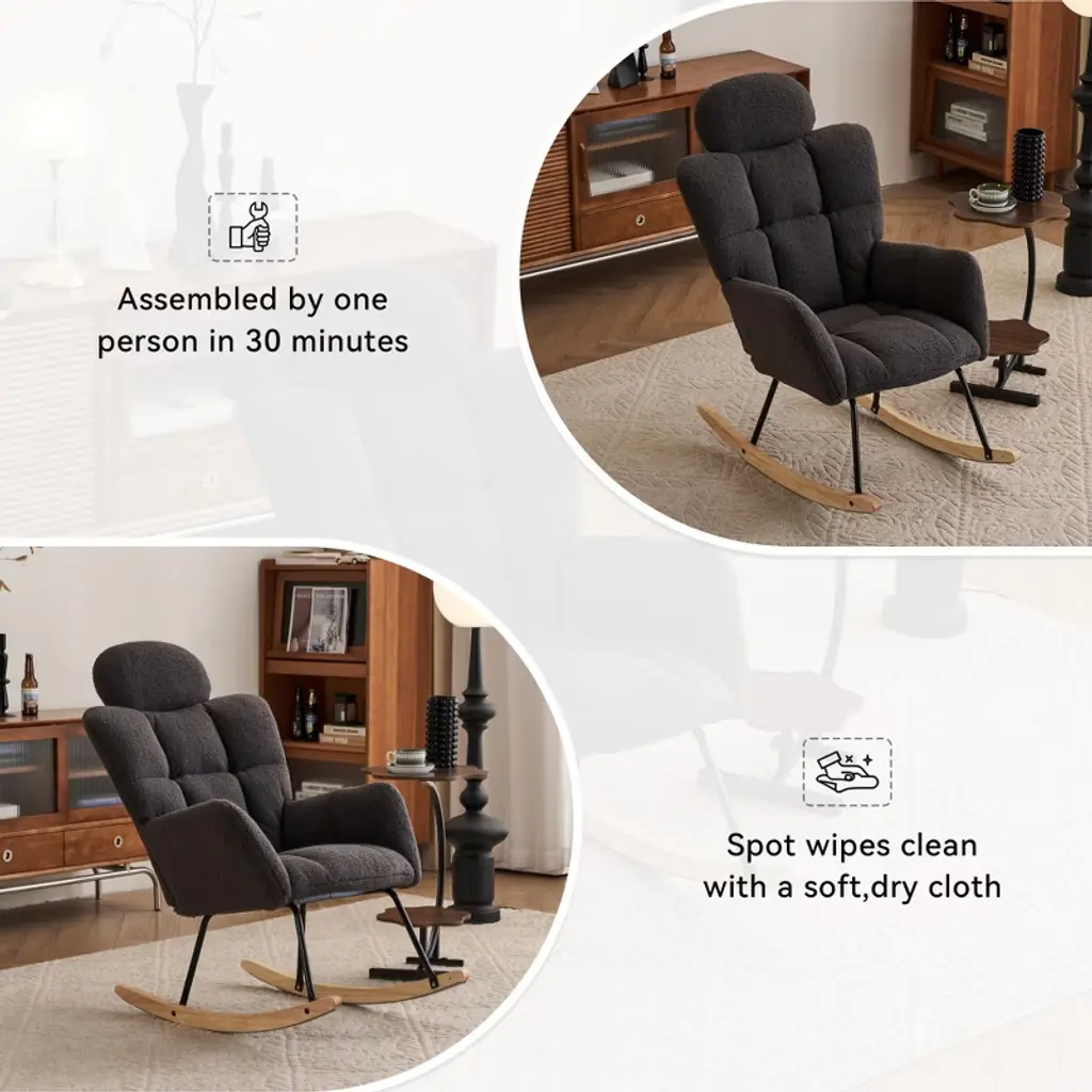 Elevate your nursery or living space with our modern Teddy Fabric Upholstered Rocking Glider Chair. This accent armchair boasts a padded seat and high backrest for ultimate comfort, accompanied by a plush pillow for added support. The soft teddy fabric adds a touch of warmth and luxury, making it perfect for cozying up with your little one or relaxing after a long day. The smooth gliding motion provides a soothing experience, ideal for nursing, reading, or simply unwinding. With its stylish design and sturdy construction, this chair is a versatile addition to any bedroom or living room, offering both functionality and aesthetic appeal.