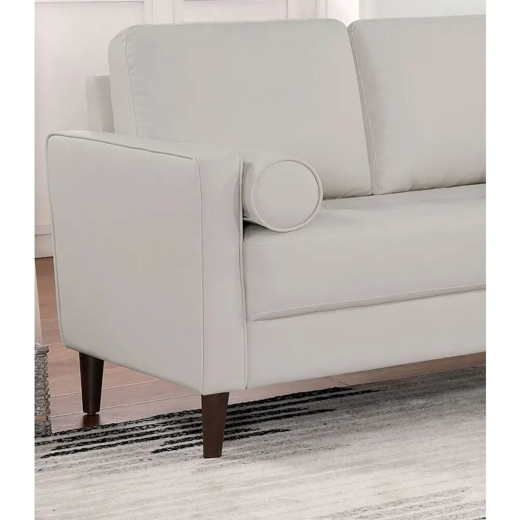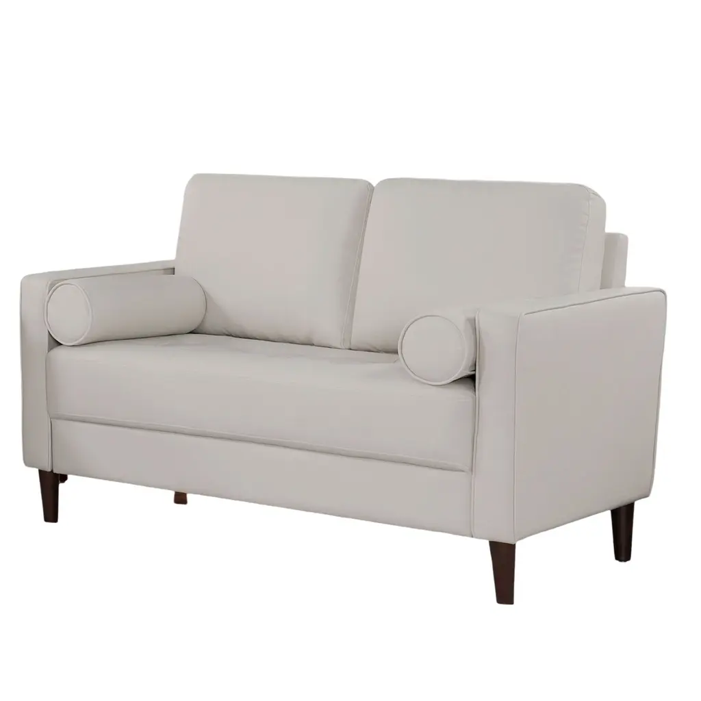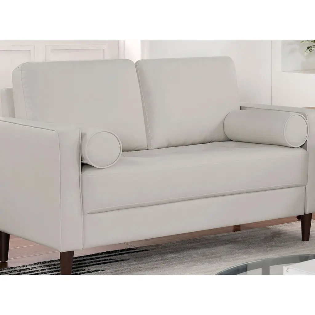 ▷Product Description Description:- This leatherette sofa will bring you back to the long gone era of cigars and wine. Here we find elements such as loose pillow backs, a pair of bolter pillows, and a tufted one-piece seat cushion. The arms are trimmed with welt that innocuously matches the color of the body. The simple, wooden legs are tapered and finished in warm walnut. Exuding an unmistakable mid-century modern vibe, this retro-modern piece reminds us of a few decades back, with colors that explicitly evoke the turn of the late 60s. Dimensions:- Sofa: 75 5 ▷8"L X 31 1 ▷8"W X 33 1 ▷2"H (SEAT HT: 18 7 ▷8", SEAT DP: 20 1 ▷2") Listing Includes :- 1pc Sofa Only. Loveseat And Chair Not Included. Simple assembly require. Features:- Mid-century Modern Off-White Leatherette, Solid Wood, Others Bench-style Seating Round Tapered Legs USB Outlet Bolster Pillows Include ▷Mid-century Modern ▷Off-White ▷Bench-style Seating ▷Round Tapered Legs ▷USB Outlet ▷Bolster Pillows Included ▷Leatherette, Solid Wood, Others ▷Listing Includes :- 1pc Sofa Only.