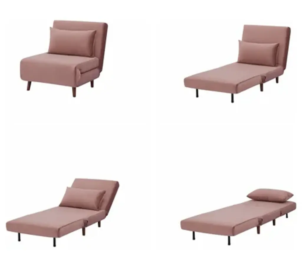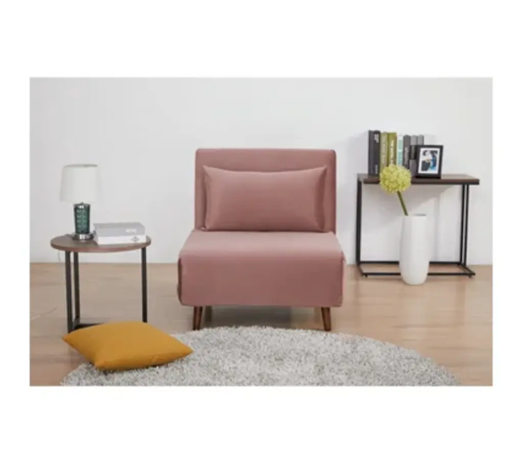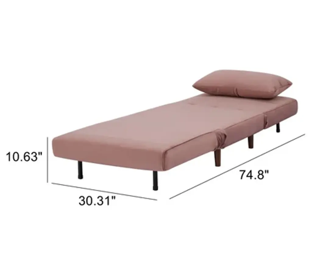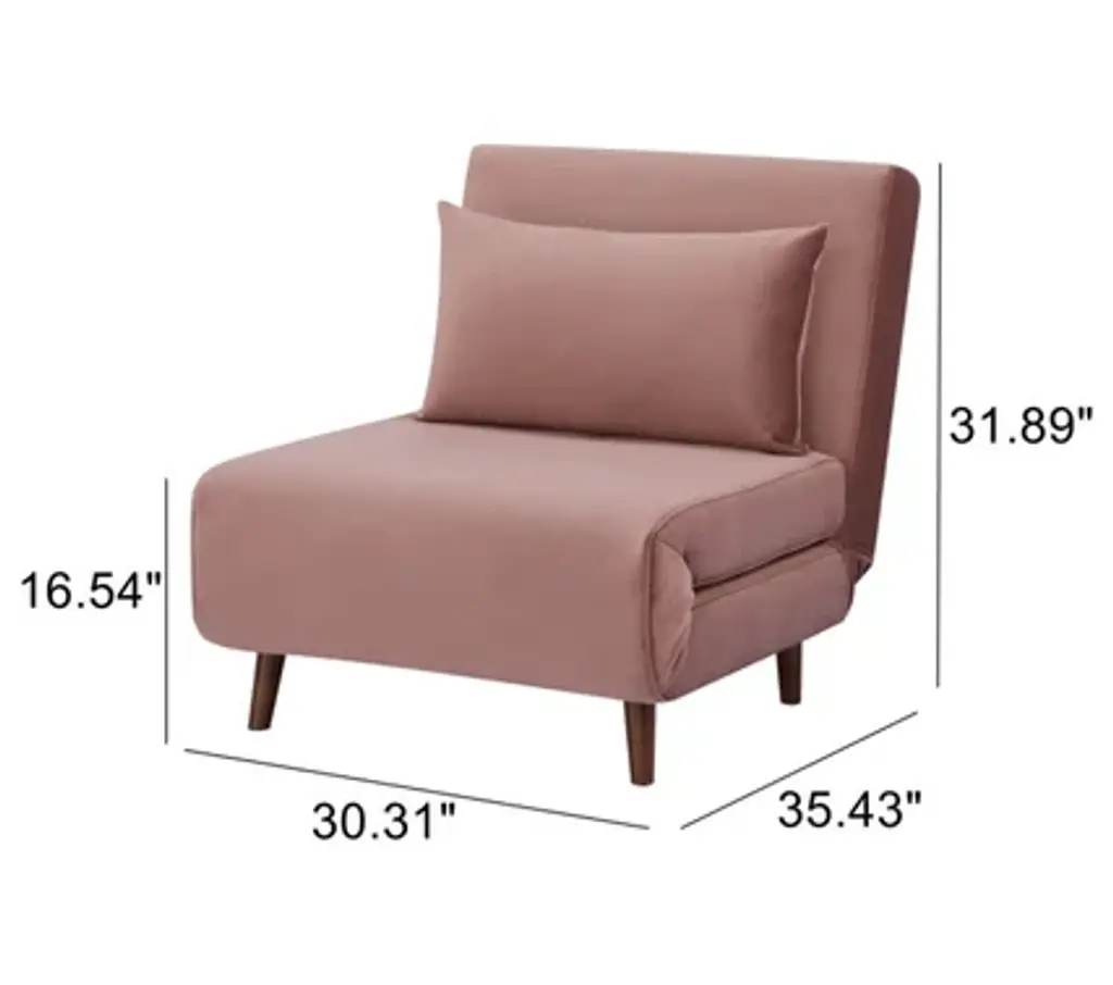 Easily converts from a chair to a chaise lounge or a twin bedMade of a robust pine wood frameCushioned with comfortable and supportive foamUpholstered in a 100% velvet polyester fabricSupported by 4 solid wood birch legs and 4 hidden support legs for bed positionIncludes 1 matching pillow, convertible chair, legs, and hardwareNote: Legs and hardware are located under the sofa in the lining inside a zippered pocketProduct size: W 30.31" x D 35.43" x H 31.89"