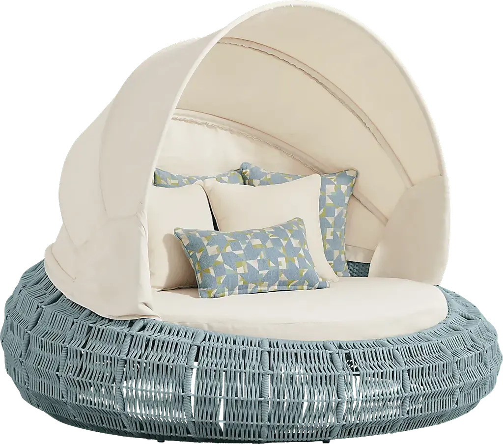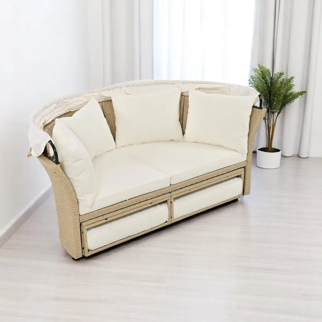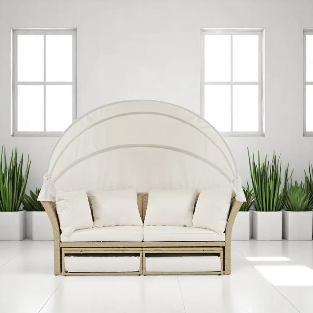 Convertible Patio Daybed With Retractable Canopy, Cushions, And Pillows – Rattan & Iron Frame For Outdoor Use-beige
