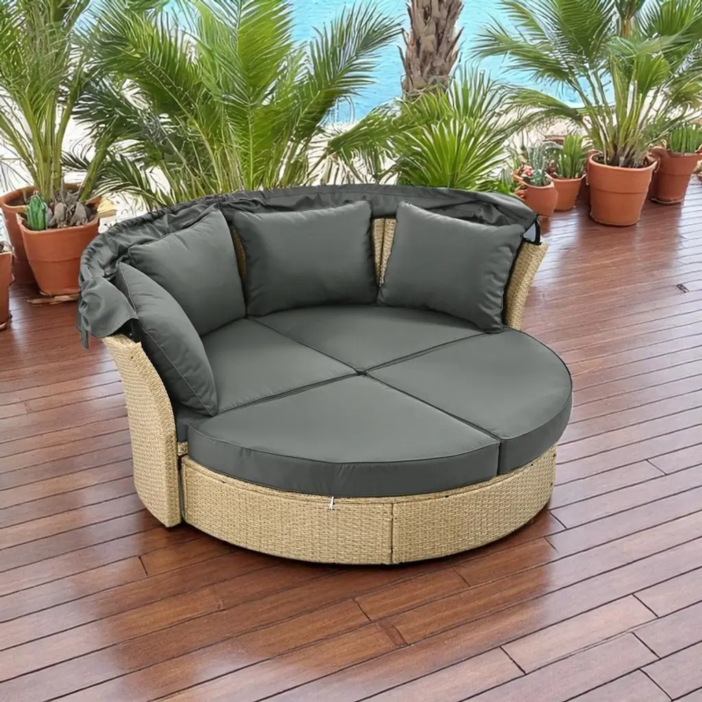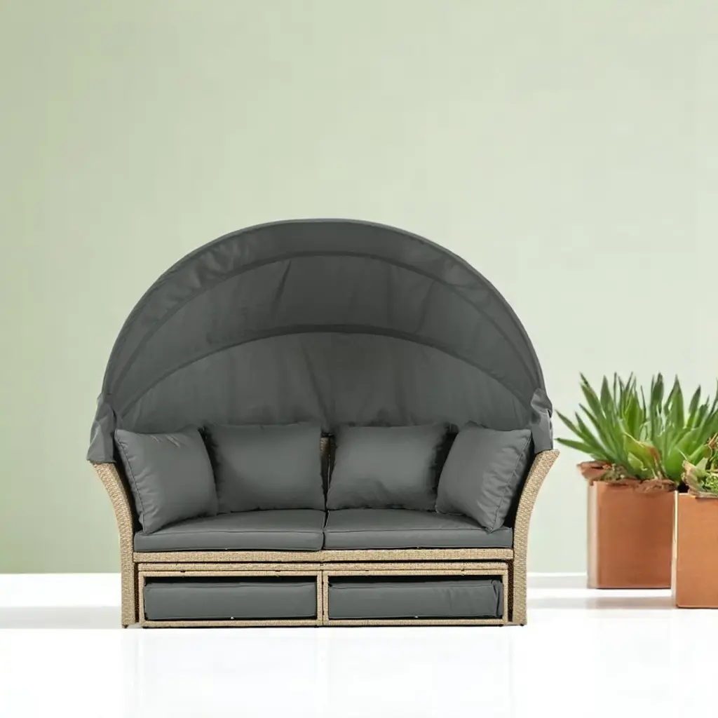 Product Overview Transform your outdoor space with this convertible patio daybed, designed for comfort, style, and versatility. Made with durable wicker rattan and a sturdy iron frame, this outdoor daybed includes soft, removable cushions and pillows for ultimate relaxation. The daybed easily converts into a loveseat, and the retractable canopy provides adjustable shade, making it ideal for enjoying the outdoors on sunny days. Whether you’re hosting guests or unwinding alone, this daybed offers comfort and elegance to enhance any patio, porch, or backyard. Product Features Convertible Patio Daybed: Switch effortlessly between a loveseat and daybed, offering versatile seating options that cater to your outdoor comfort and entertaining needs. Retractable Canopy: The retractable canopy allows you to adjust the shade for warm days, providing comfort and protection from the sun while enjoying outdoor time. Comfortable Cushions and Pillows: Soft padded cushions and four included pillows add a luxurious touch, with removable, washable cushion covers for easy maintenance. Ready for Outdoor Use: Built with durable wicker rattan and a sturdy iron frame, this daybed is weather-resistant and perfect for withstanding outdoor elements while ensuring comfort. Big & Stylish Design: With ample space for up to two people, this large, stylish daybed adds a modern and elegant touch to any outdoor setting, including patios, porches, or poolside areas. Specifications Dimensions: Overall: 71.7" L x 63.4" W x 62.2" H Weight: 81.57 lbs Weight Capacity: 325 lbs per seat Material: Wicker Rattan, Iron Frame, Polyester Cushions Pillows Included: 4 pillows Assembly Required: Yes (Estimated time: 30-40 minutes) Color: Grey Suitable Scenarios This convertible patio daybed is perfect for various outdoor settings, including patios, porches, backyards, gardens, and poolside areas. Whether you’re relaxing, hosting outdoor gatherings, or enjoying a peaceful day in the sun, this daybed provides the ideal combination of comfort, style, and functionality for any outdoor space. Notes Maintenance: Clean periodically with a soft bristle brush and mild detergent. Ensure the furniture is completely dry before storing or covering to avoid moisture build-up. Color Notice: The actual product color may slightly differ from images due to lighting or monitor settings. Size Notice: Manual measurements may result in slight dimensional variations.
