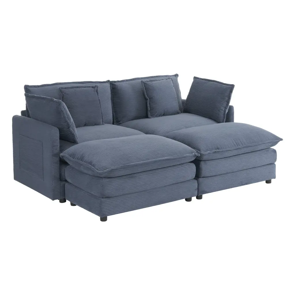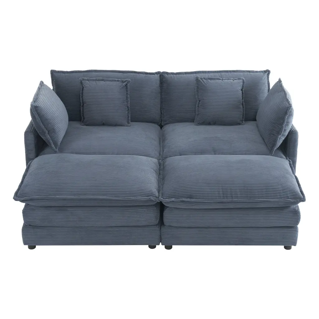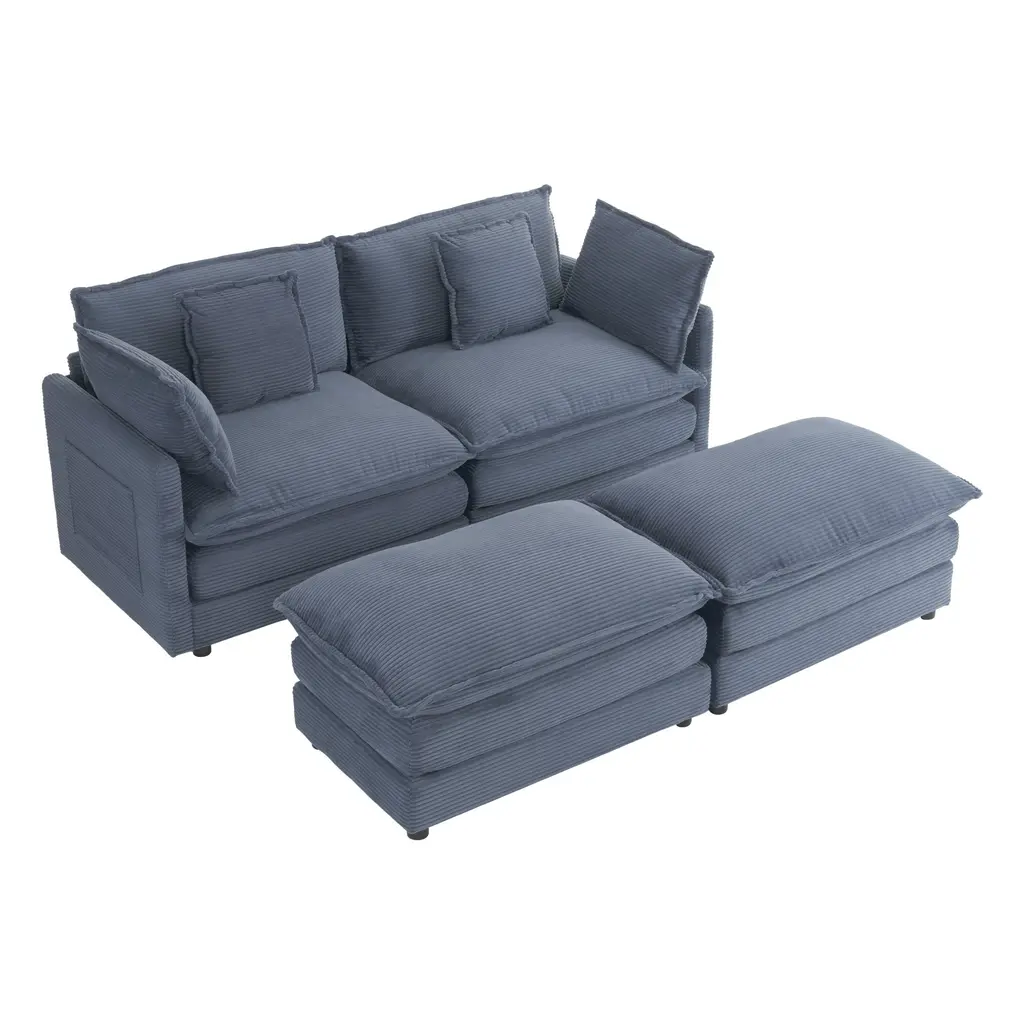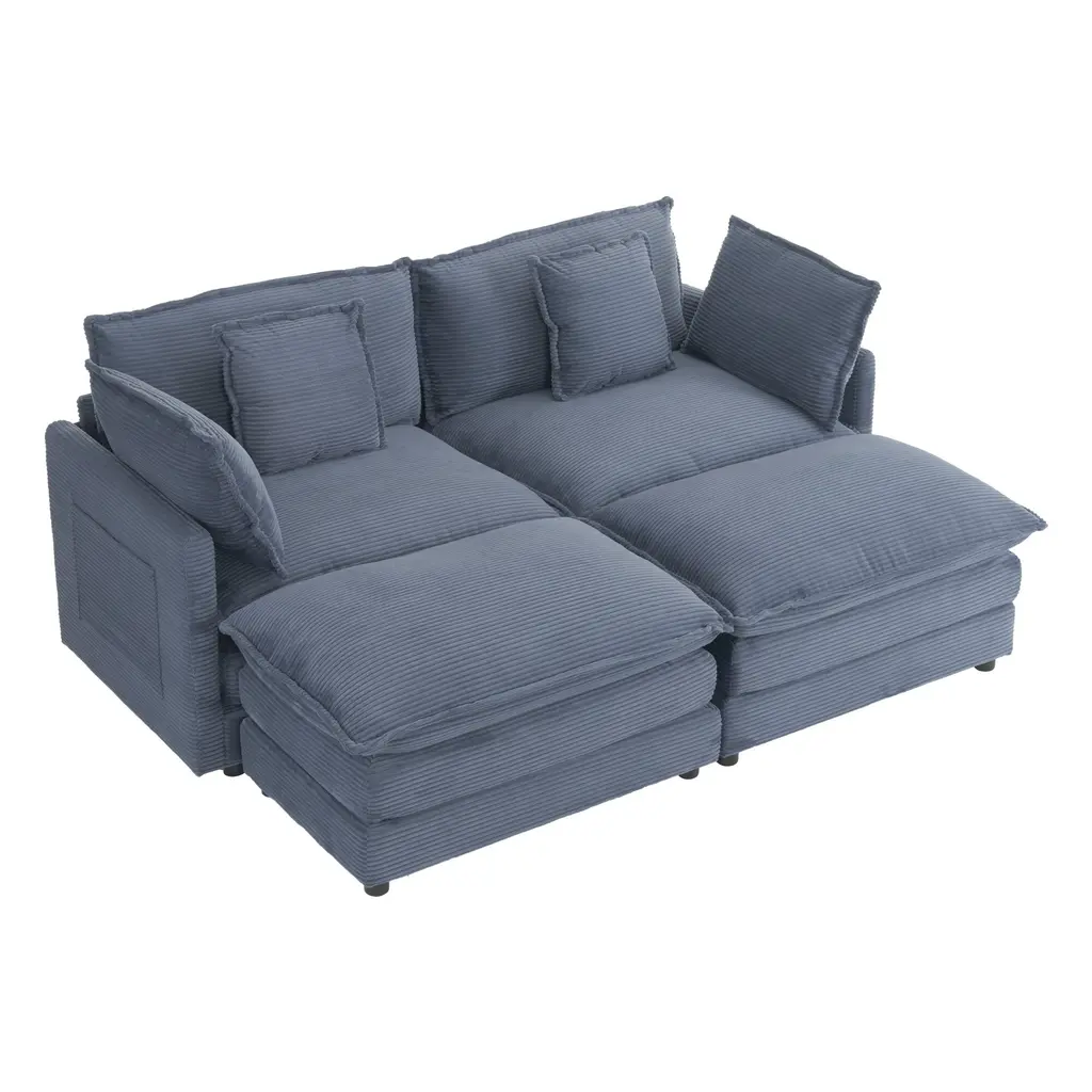 Corduroy Loveseat Set With Movable Ottoman 4 Seater Corner Sofa, Upholstered Deep-Seat Couch Wcushions And 4 Pillows Brown - Blue