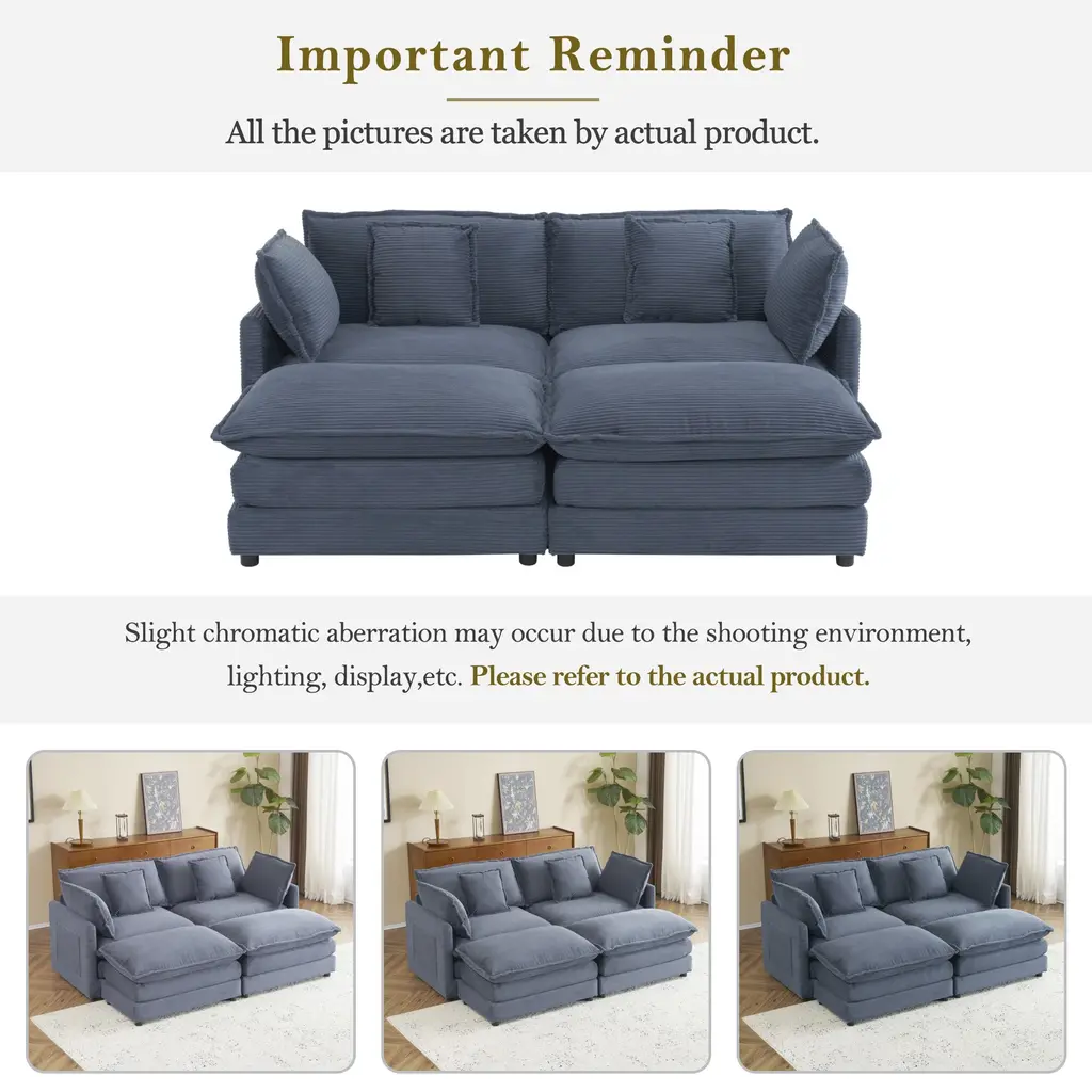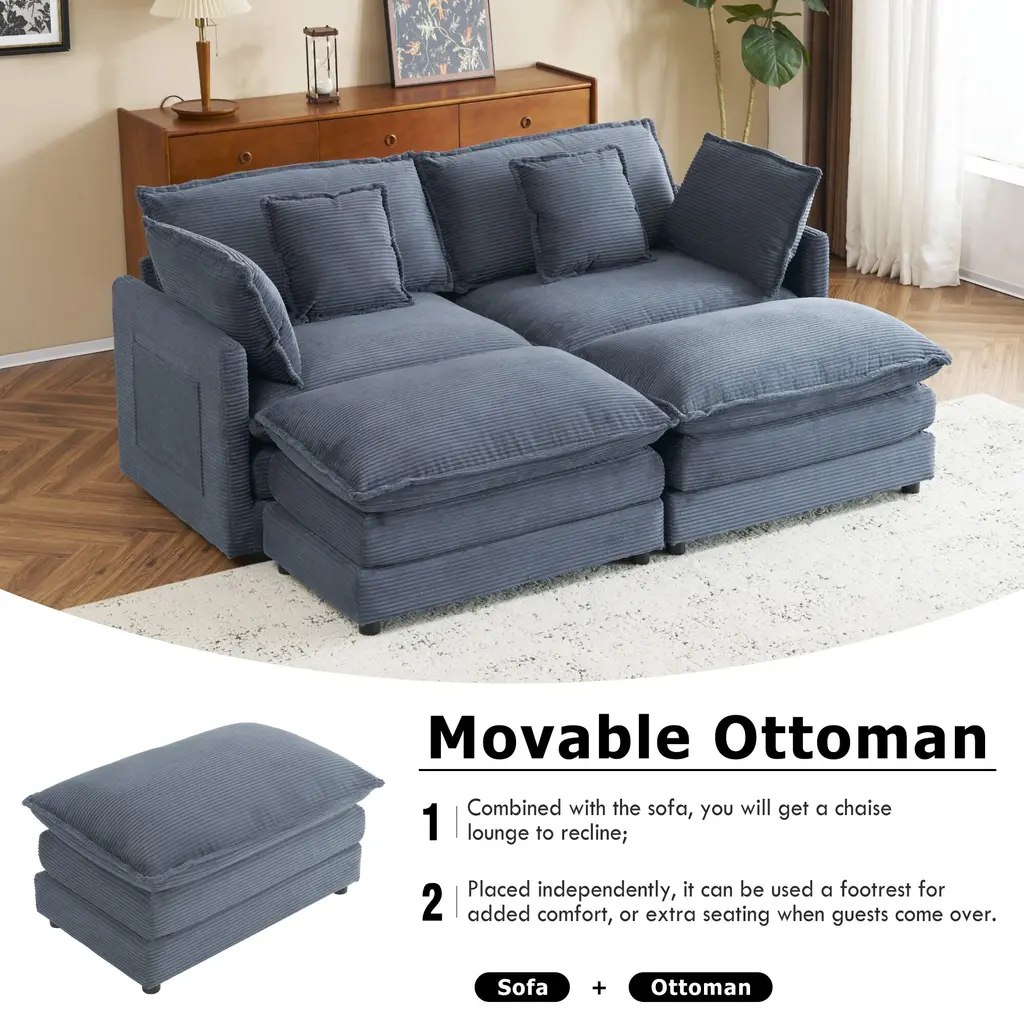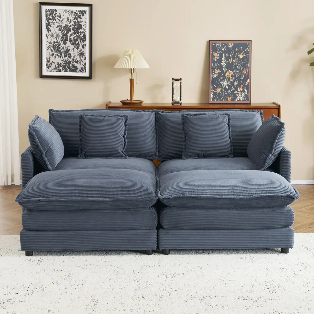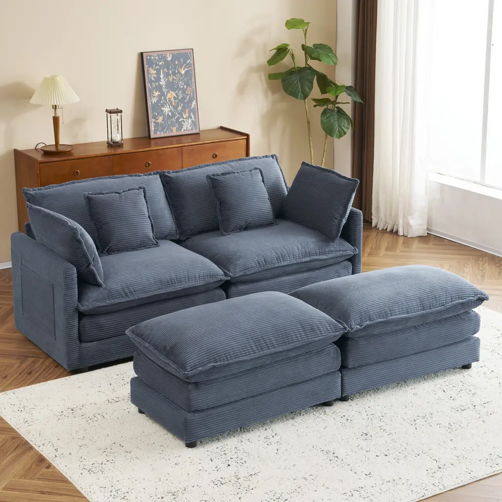 Corduroy Loveseat Set With Movable Ottoman 4 Seater Corner Sofa, Upholstered Deep-Seat Couch Wcushions And 4 Pillows Brown - Blue
