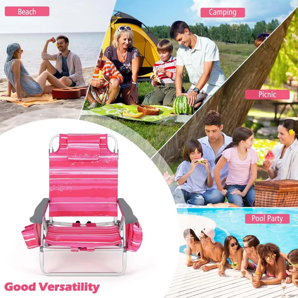 Costway 4-pack Folding Backpack Beach Chair 5-position Outdoor Reclining Chairs With Pillow Dark Pink