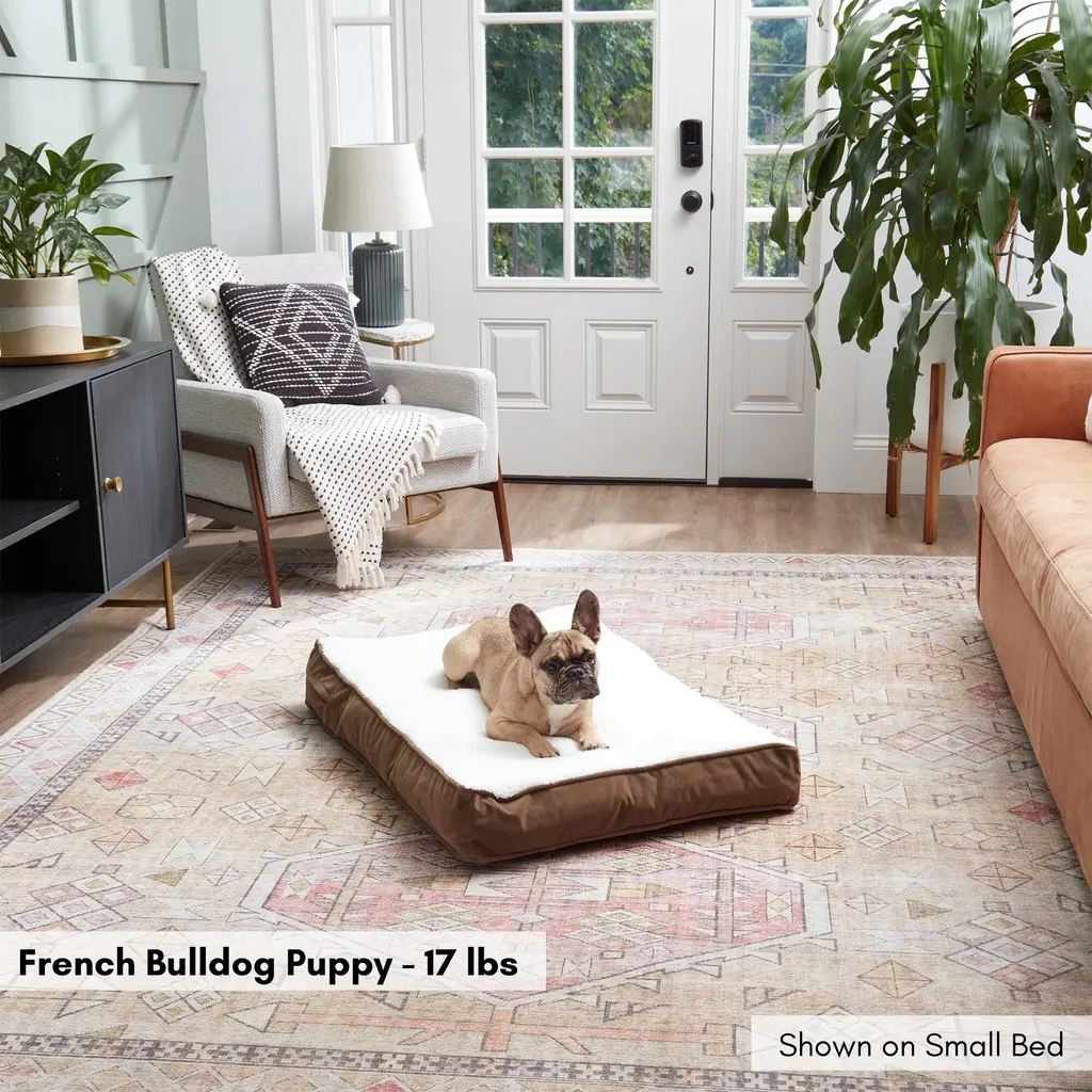 Give your dog a cozy and supportive place to rest at the end of a long day with this Daisy Deluxe dog bed by Happy Hounds. Featuring a snuggly soft Sherpa top panel, and velvety microfiber fabric this bed will offer a welcoming spot to nestle in for a long nap. A tacked insert construction ensures the fill remains evenly distributed across the bed, providing consistent comfort and added support. Ideal for for elderly dogs, dogs with arthritis, joint pain or other needs.