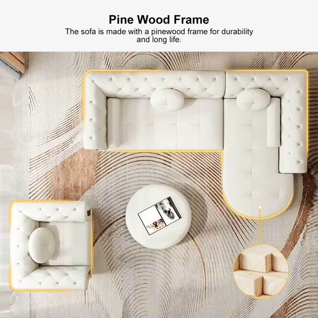 Dodiy Modern L-Shaped White Tufted Corner Sectional Sofa 6-Seater With Ottoman & Pillows