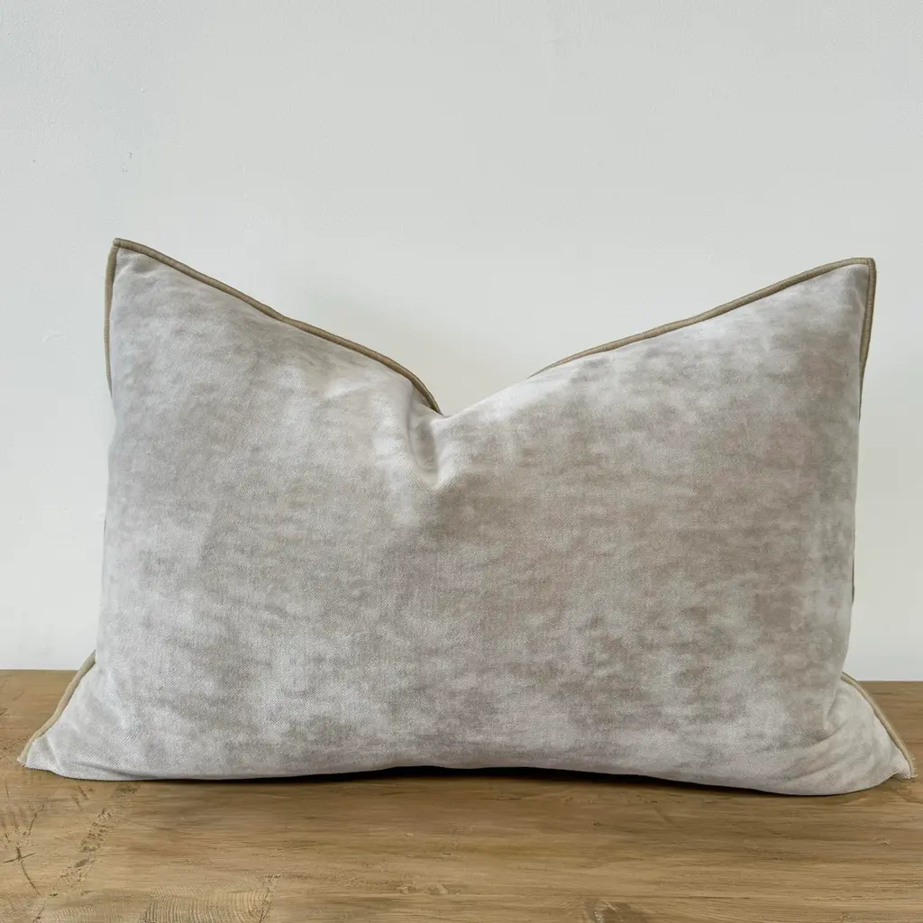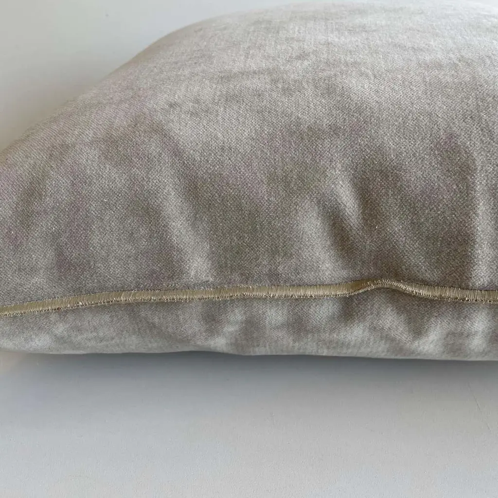 European vintage velvet accent pillow with down feather insert Size: 14" x 23" Color: Ciment (a light gray) Zipper closure, with decorative edge Our pillows are constructed with vintage one of a kind textiles from around the globe. Carefully constructed with the finest textiles, with hidden zipper closure, and overlocked seams. Made in France.
