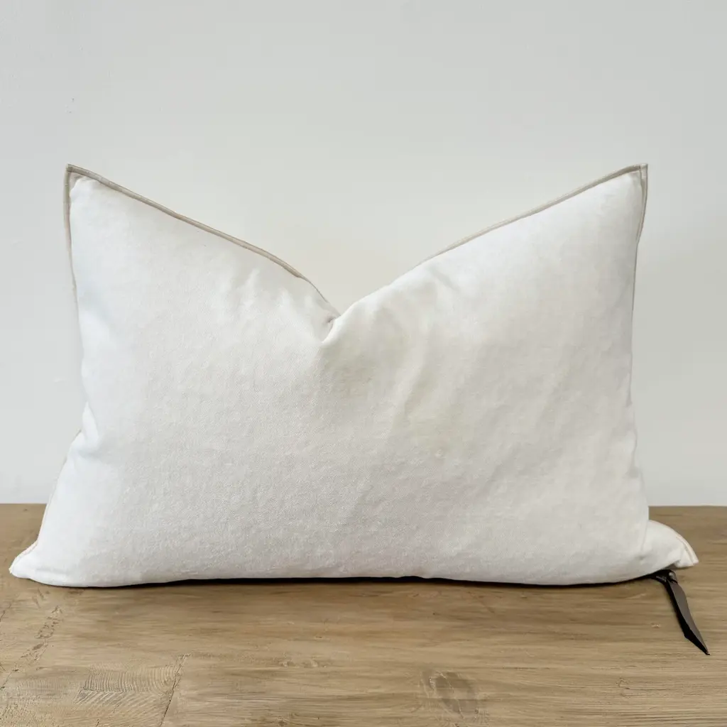 European vintage velvet accent pillow with down feather insert Size: 14" x 23" Color: Creme (a creamy white) Zipper closure, with decorative edge Our pillows are constructed with vintage one of a kind textiles from around the globe. Carefully constructed with the finest textiles, with hidden zipper closure, and overlocked seams. Made in France.