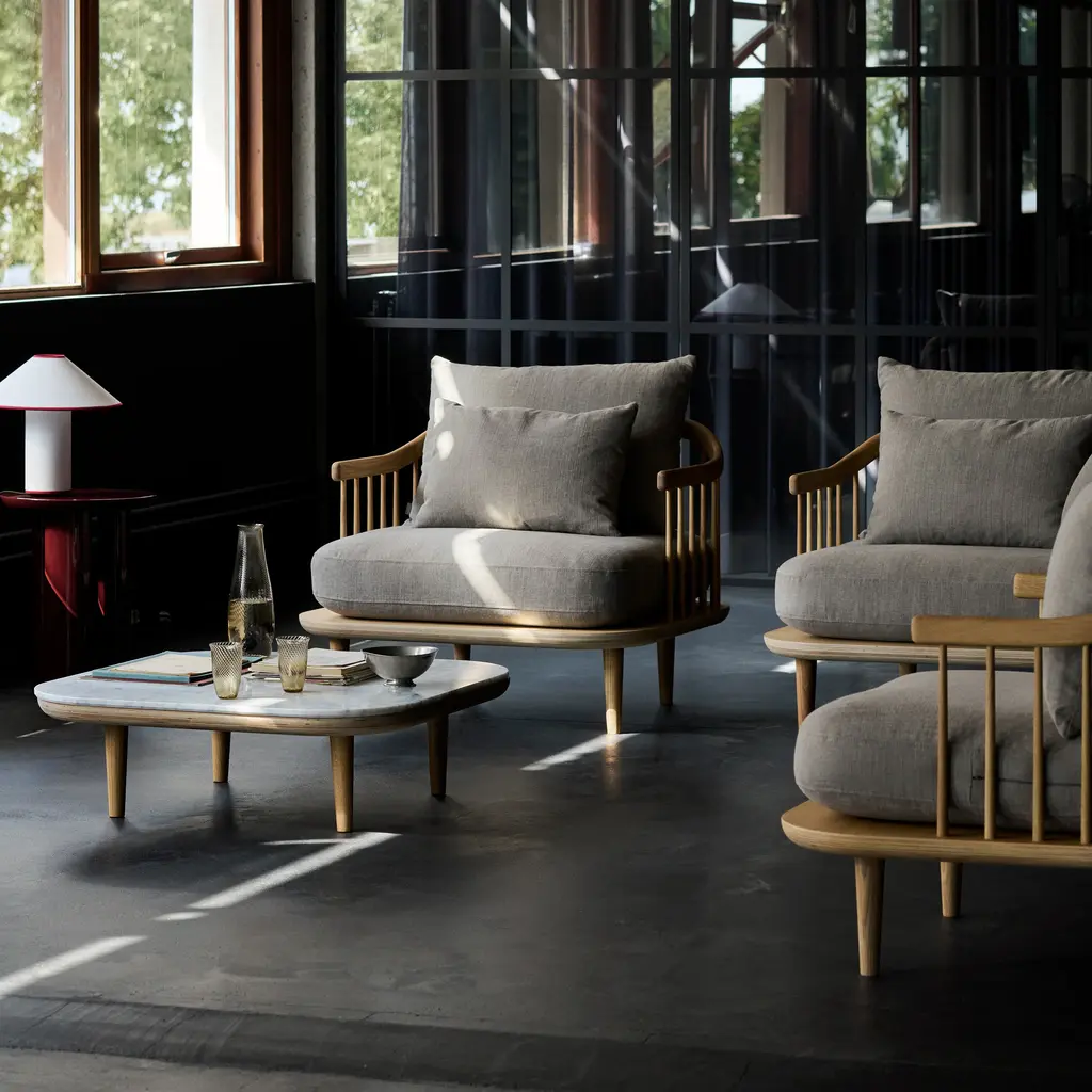 The Fly Lounge Chair with Pillow from &tradition is a sculptural masterpiece, boasting a classic Nordic aesthetic and solid craftsmanship. Space Copenhagen's Fly series offers versatility and ultimate relaxation, with a slatted wood backrest and optimized seat for comfort. Arrange the loose cushions to your own needs for a truly luxurious experience. Highlights