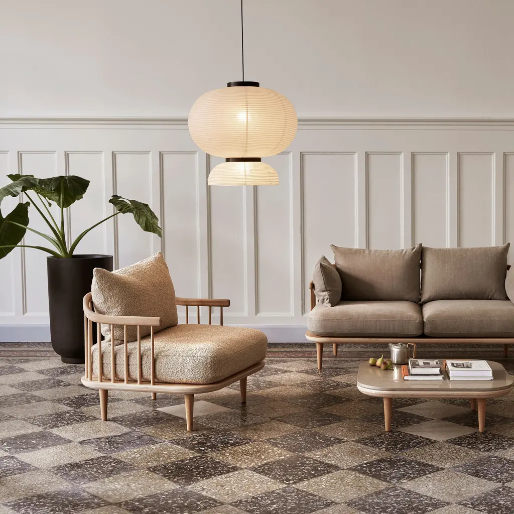 The Fly Lounge Chair with Pillow from &tradition is a sculptural masterpiece, boasting a classic Nordic aesthetic and solid craftsmanship. Space Copenhagen's Fly series offers versatility and ultimate relaxation, with a slatted wood backrest and optimized seat for comfort. Arrange the loose cushions to your own needs for a truly luxurious experience. Highlights